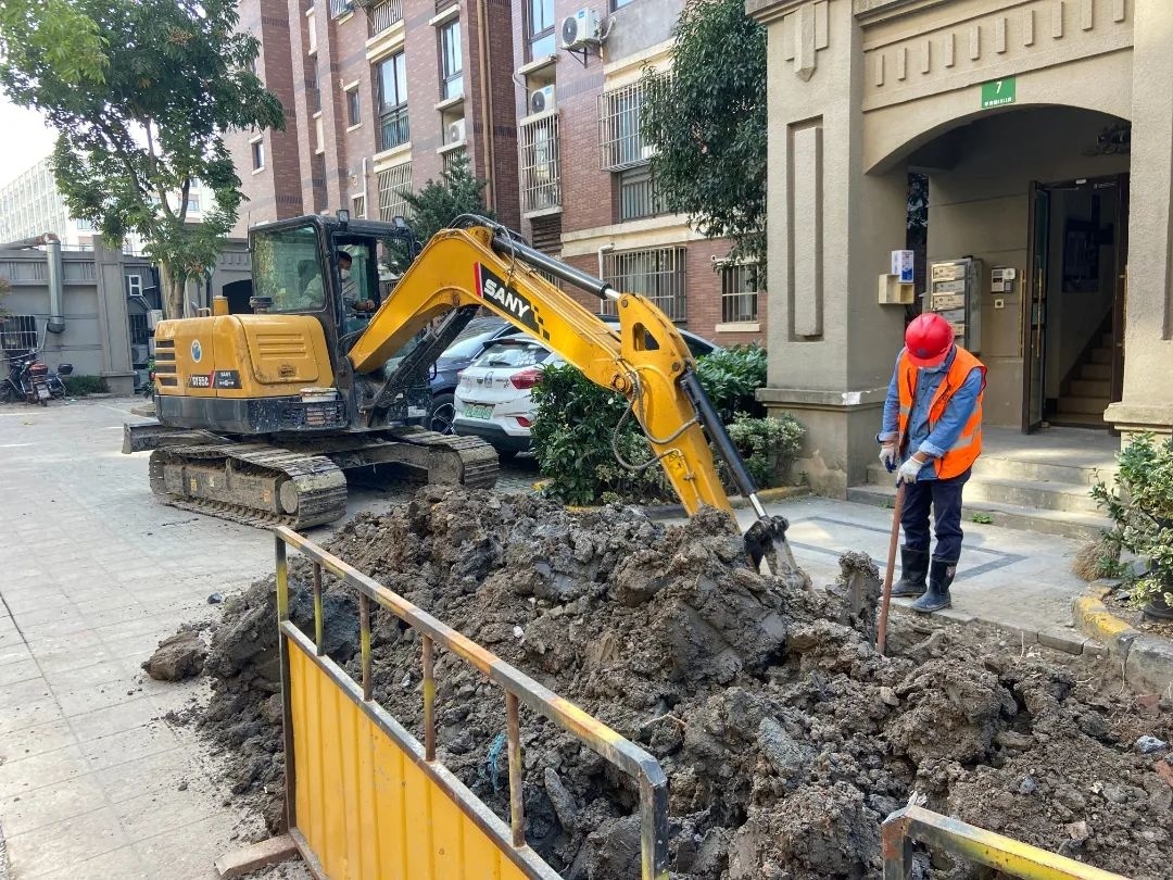 在施工之前,我们提前和小区“三驾马车”开过协调会,内容包括施工铭牌、安全告示等。开挖前,我们也和物业相互配合,提前告知居民将车辆停到小区外面,我们在小区外面也设置了临时停车点。