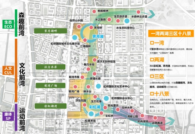 彩虹湖湾:承载高品质艺术文化。依托虹桥国际文化艺术中心,引入世界一流的文艺演出和艺术展览,打造上海西部高端文化名片。彩虹桥飞跃湖面,桥上装置制造的水雾,在阳光下映射出绮丽彩虹,与湖水倒映的城市景观构成虹桥前湾独具特色的风景。