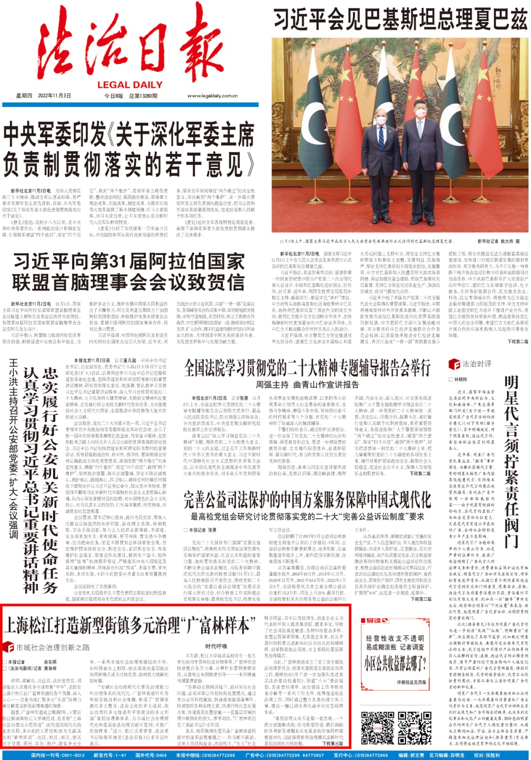 今天(11月3日)出版的《法治日报》在头版刊发文章《上海松江打造新型街镇多元治理“广富林样本”》,点赞松江广富林街道形成的“管理资源的多元整合、法治文化的多元浸润、依法治理的多元推进和平安建设的多元和谐”基层治理新体系,为市域社会治理现代化和基层依法治理贡献可复制、可推广的新样本。