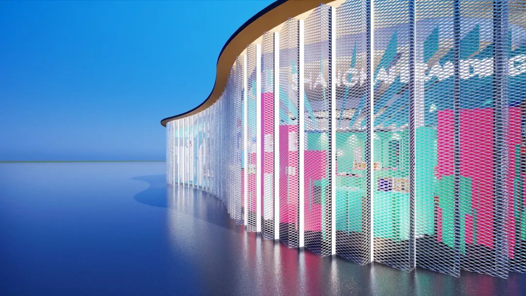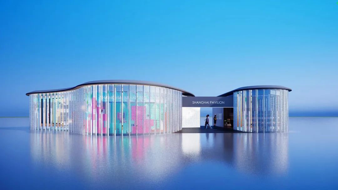 上海馆以抽象地图轮廓作为整体空间形象,以“长江入海口”作为主入口,提炼黄浦江水文走势,打造滨江两岸“百年华章”“时尚引领”两大展区。充满未来感的金属网格外立面和时尚活力的彩色展区,透叠形成流光溢彩的上海馆外观,演绎“开放、创新、包容”的城市品格,彰显“海纳百川、追求卓越、开明睿智、大气谦和”的城市精神。