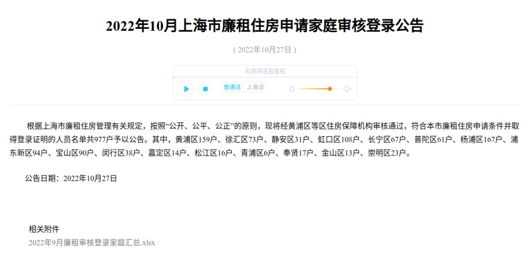 根据上海市廉租住房管理有关规定,按照“公开、公平、公正”的原则,市房屋管理局现将经黄浦区等区住房保障机构审核通过,符合本市廉租住房申请条件并取得登录证明的人员名单共977户予以公告。