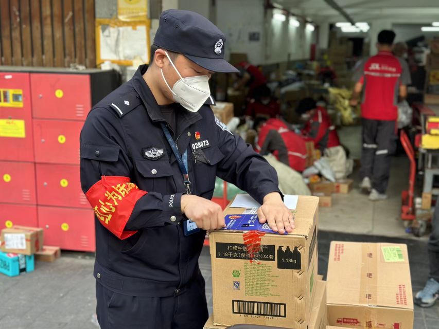 11月2日下午,在南苏州路71号的京东快递分拣点上,江宁路派出所民警走上了快递流水线,与快递员一起“分拣”快递包裹,为包裹分类贴上反诈宣传贴纸、“安全购物指南”、“防疫贴士”等醒目的外部张贴,并将这些包裹装入“反诈包装袋”交付派送。