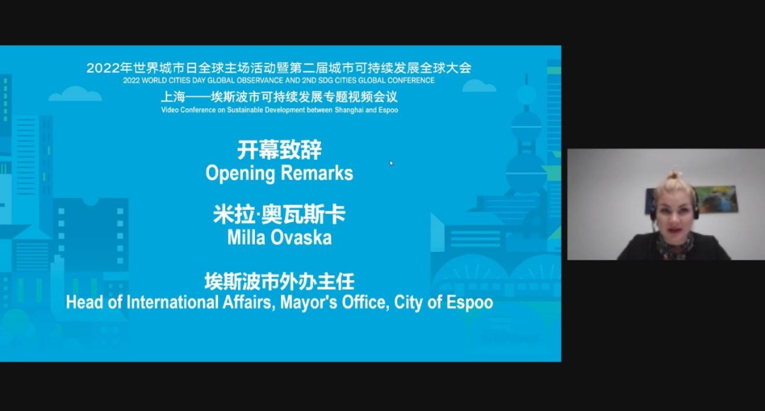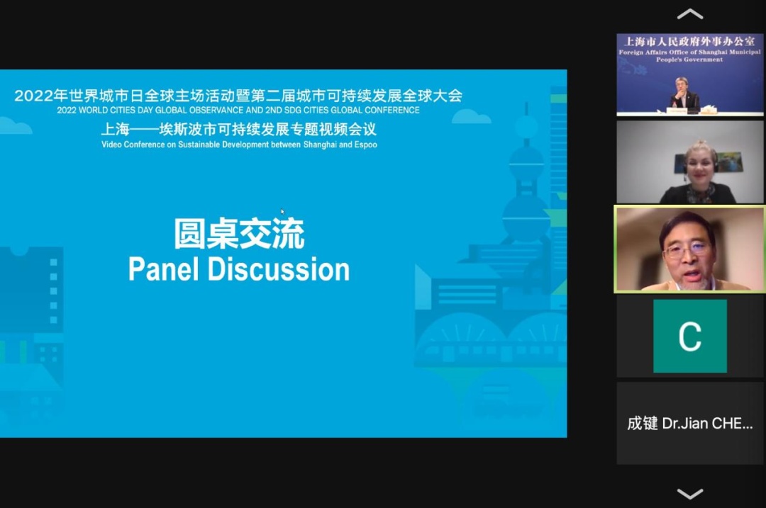 2022年世界城市日全球主场活动暨第二届城市可持续发展全球会于10月31日在上海开幕,主题为“行动,从地方走向全球”。作为第二届城市可持续发展全球大会的活动之一,上海—埃斯波市可持续发展专题视频会议于北京时间11月2日下午在云端顺利举行。本次论坛的主题为“联合国可持续发展自评估与提升城市治理能力”,由上海社会科学院城市与人口发展研究所与芬兰埃斯波市外事办公室共同主办,在上海市政府外事办公室和上海世界城市日事务协调中心的支持下举办。