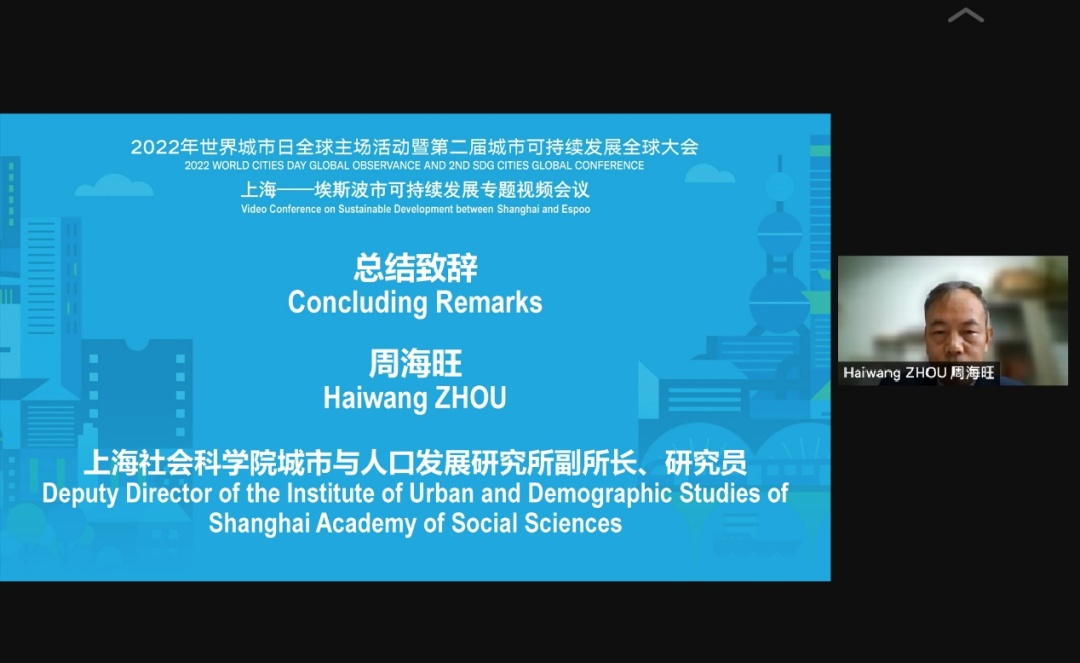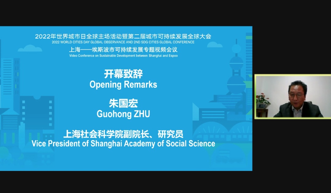 上海社会科学院副院长朱国宏研究员、埃斯波市外办主任米拉·奥瓦斯卡、上海市人民政府外事办公室副主任刘光勇出席当天会议并发表致辞;上海世界城市日事务协调中心主任成键、埃斯波市长办公室可持续发展中心“2030议程”项目负责人维尔·塔亚马、上海社会科学院研究员邓智团、城市可持续发展目标网络战略意义构建进程协调员伊芙琳娜·基马-玛亚宁在线发表主旨演讲;上海社会科学院城市与人口发展研究所副所长屠启宇、维尔·塔亚马、伊芙琳娜·基马-玛亚宁、上海市政府发展研究中心代表等参与了线上圆桌交流。上海社会科学院城市与人口发展研究所副所长周海旺主持了本次会议。