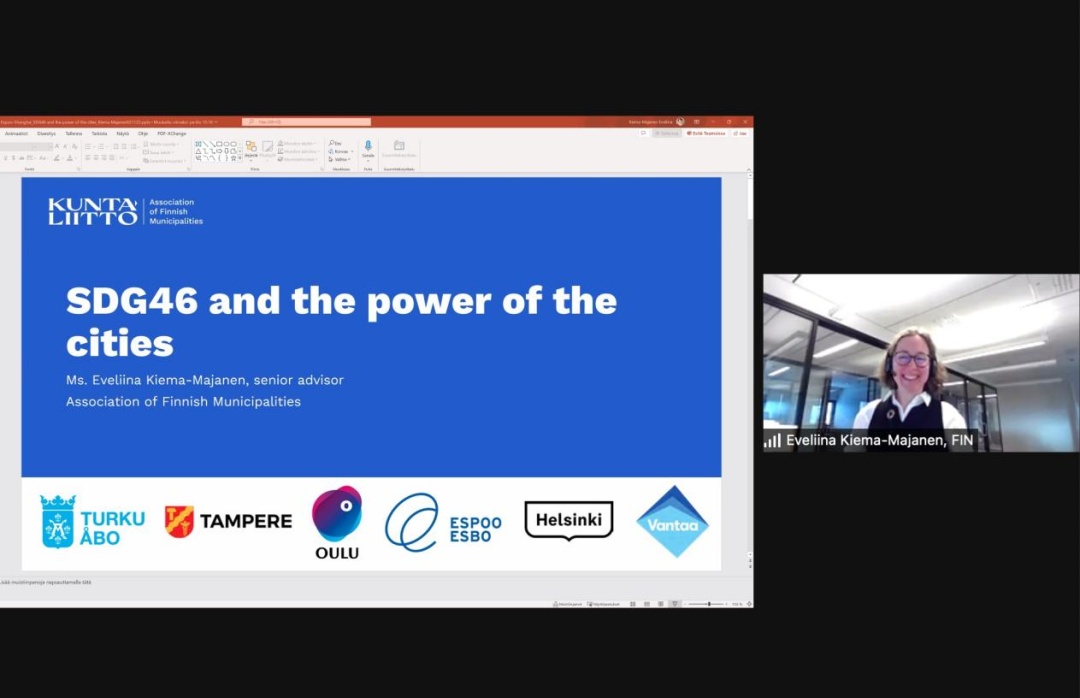 城市可持续发展目标网络战略意义构建进程协调员伊芙琳娜·基马-玛亚宁发表了“SDG46和城市网络力量”的报告,阐释了SDG46的含义,即芬兰6个最大的城市组成的可持续发展战略的网络,介绍了近年来的主要战略行动举措,并强调了通过城市之间合作激发可持续发展潜力的重要性。
