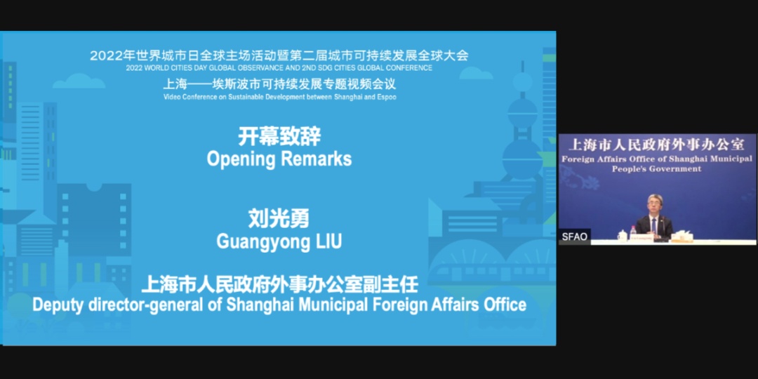 上海市人民政府外事办公室副主任刘光勇在致辞中提出,上海和埃斯波有意在友好城市基础上基于进一步拓展可持续发展目标方面的交流合作,希望借助本次会议,分享两地在实现可持续发展目标方面的经验和做法,在实现全人类的共同目标的道路上把握机遇,携手努力,互学互鉴,共同发展,促进两地友好城市交流走深走实。