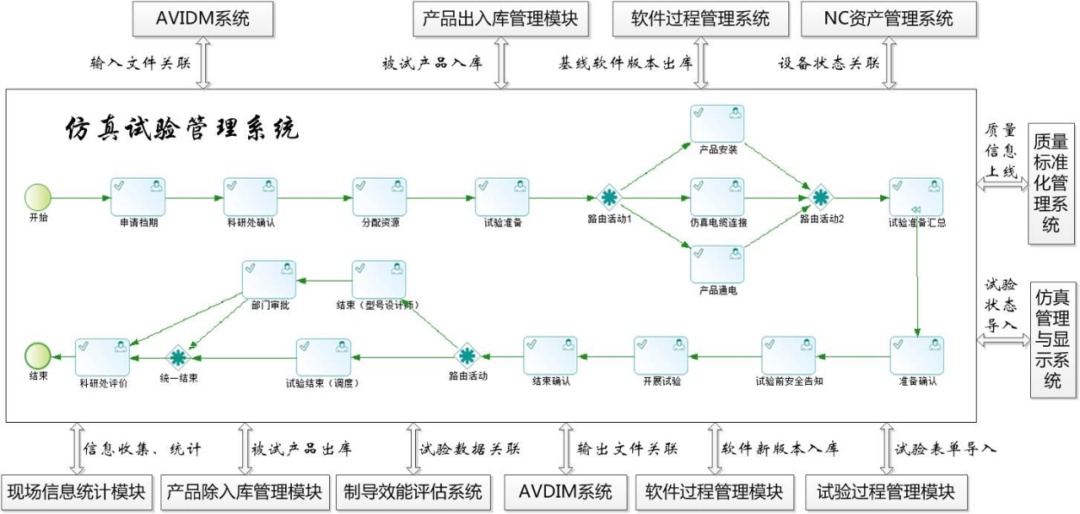 半实物仿真试验,是产品研制过程中验证最充分、考核最全面的一道关卡,是试验室条件下全面考核产品综合性能最有效的验证手段。半实物仿真试验是一个多学科、多专业的复杂系统工程,涉及试验人员、参试设备、被试对象、测试方法、测试环境、信息化管理等多个方面。上海机电工程研究所加快推进管理创新,通过数字化建设,自主研发“仿真试验管理系统”,统筹协调人、机、料、法、环、测、信等七维空间资源,基于流程驱动构建“实战化”的仿真环境,高效率开展试验,实现半实物仿真试验全流程、全要素信息化管控。
