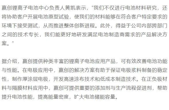 赢创大中华区总裁夏赋良表示,“中国力争在2060年实现碳中和,这一目标将电动车市场的发展推向新的高度,并加快电池行业的创新速度。亚洲汇集了90%以上的锂离子电池生产商,而绝大多数顶尖生产商来自中国。赢创希望通过全新的锂离子电池中心开发高性能解决方案,为高速增长的市场提供有力支持。”