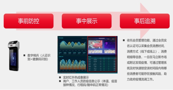 菜市场智慧防疫体系应涵盖事前防控、事中展示、事后追溯三个环节,以实现疫情及时排查筑防线、信息实时公示除恐慌、传播网络合成助流调的总体目标。