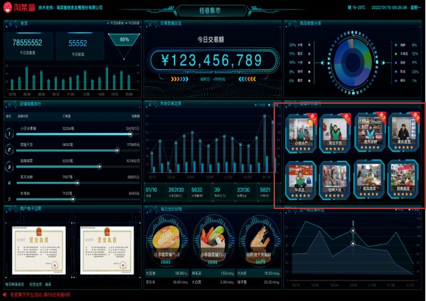 改造后的市场内配置大数据展示屏。大数据屏是市场整体运行情况的展示平台,主要呈现市场形象、促销信息、客流数据、巡检直播、交易数据总览、商品分类占比、市场交易走势、每日检测数据、菜价公示、平价菜平价肉等共计 18 个模块,所有数据和后台系统联动实时更新。通过相关数据的可视化为市场管理方的后续经营重点、经营策略供依据,同时能够刺激市场内良性竞争(如,热销铺排行可为消费者供消费导向,刺激商户通过升服务品质吸引消费者,从而形成良性循环)。