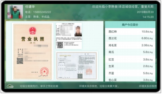 支持与档口屏投屏展示,通过后台上传的信息、销售数据,可呈现商户证件证照信息、菜价公示、商户收款码等。显示屏是商户形象的展示窗口,主要呈现商户信息、资质信息、菜价信息、优惠信息和其他公示信息等。通过排版统一、简洁大方的界面设计提升市场现代感;商户营业执照展示可消除消费者对于传统市场无证经营的顾虑;档口菜价公示增强市场信息透明化,便于消费者比对价格,也有助于向消费者传递市场规范经营的理念,提升消费者好感度。