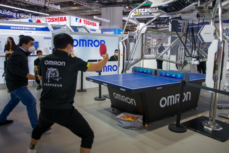 你来我往、忽上忽下,在欧姆龙展台,工作人员与欧姆龙第七代FORPHEUS乒乓球机器人激战正酣。FORPHEUS是基于 “人与机器的融合”理念而打造的乒乓球教练机器人。之前,FORPHEUS已经多次亮相进博会,但今年亮相的是其最新的第七代。11月6日下午,欧姆龙还将邀请双打世界冠军现场参与互动。