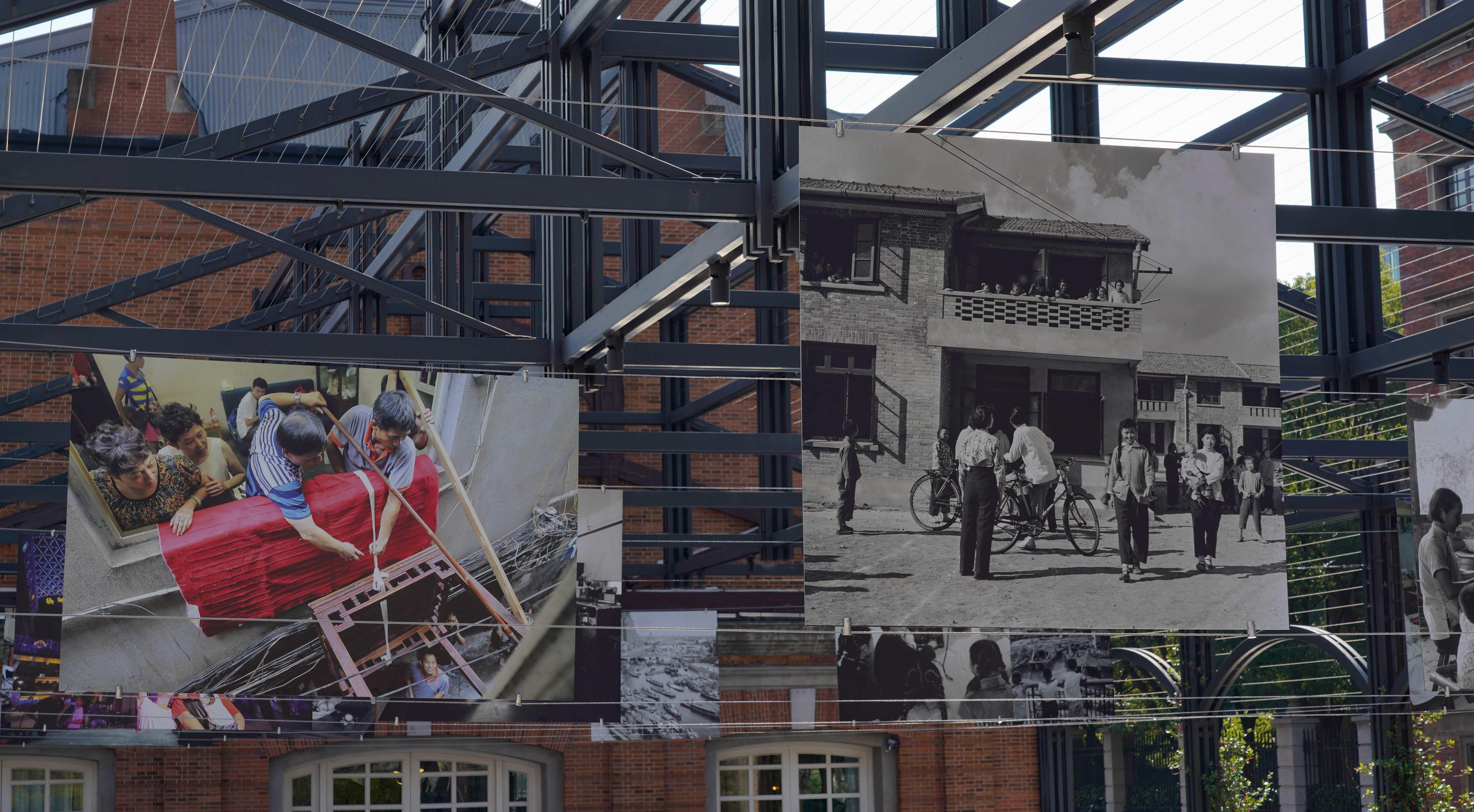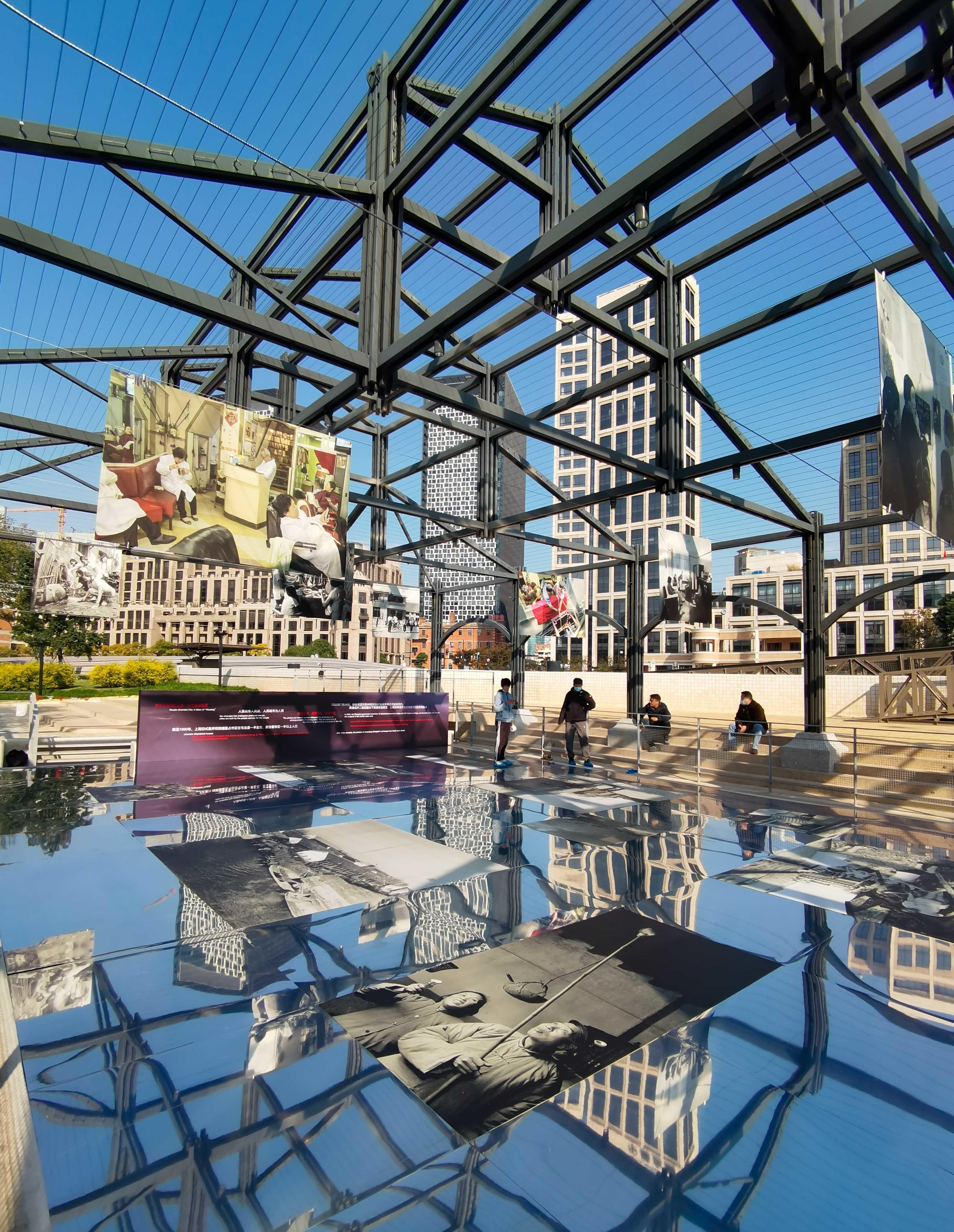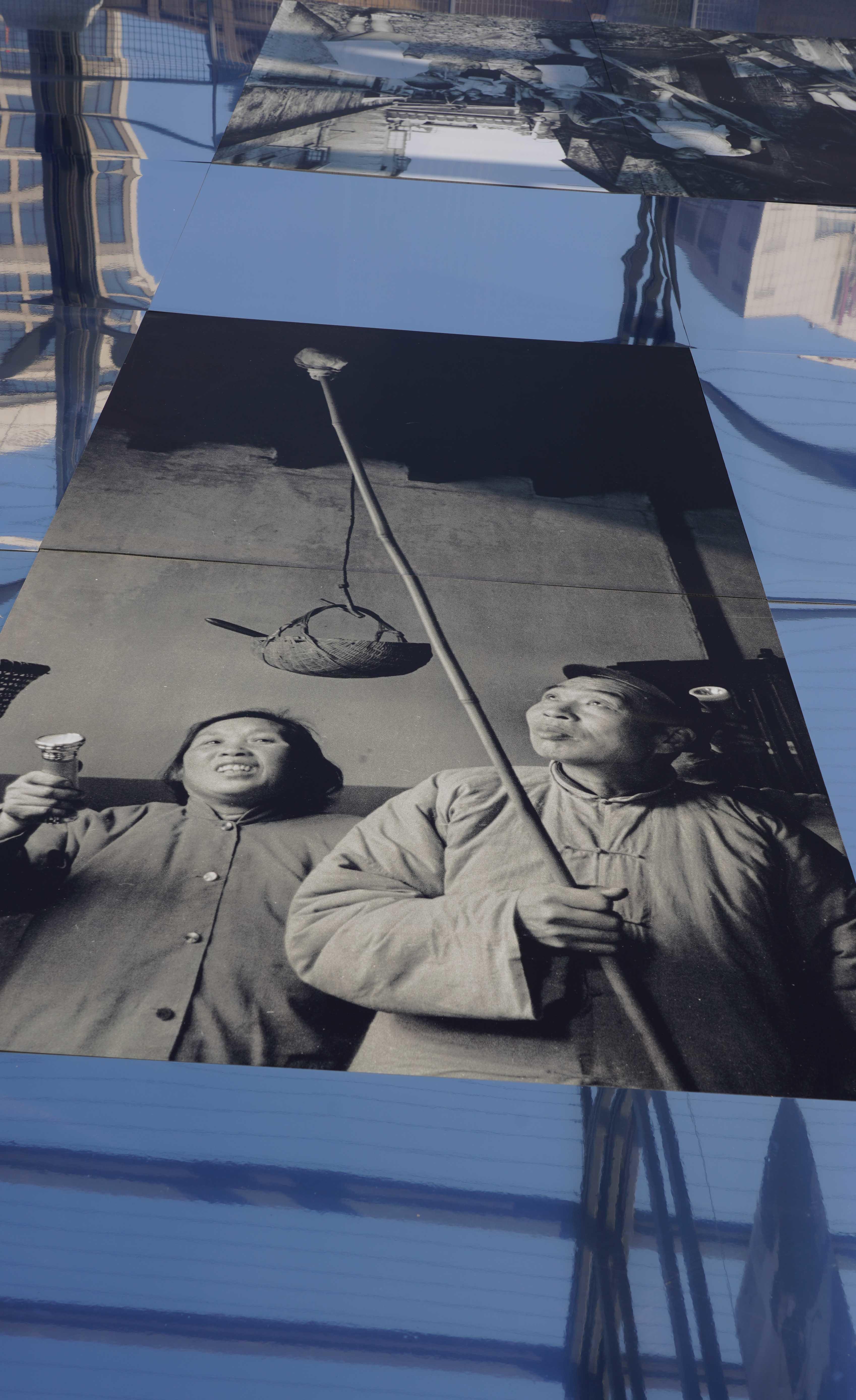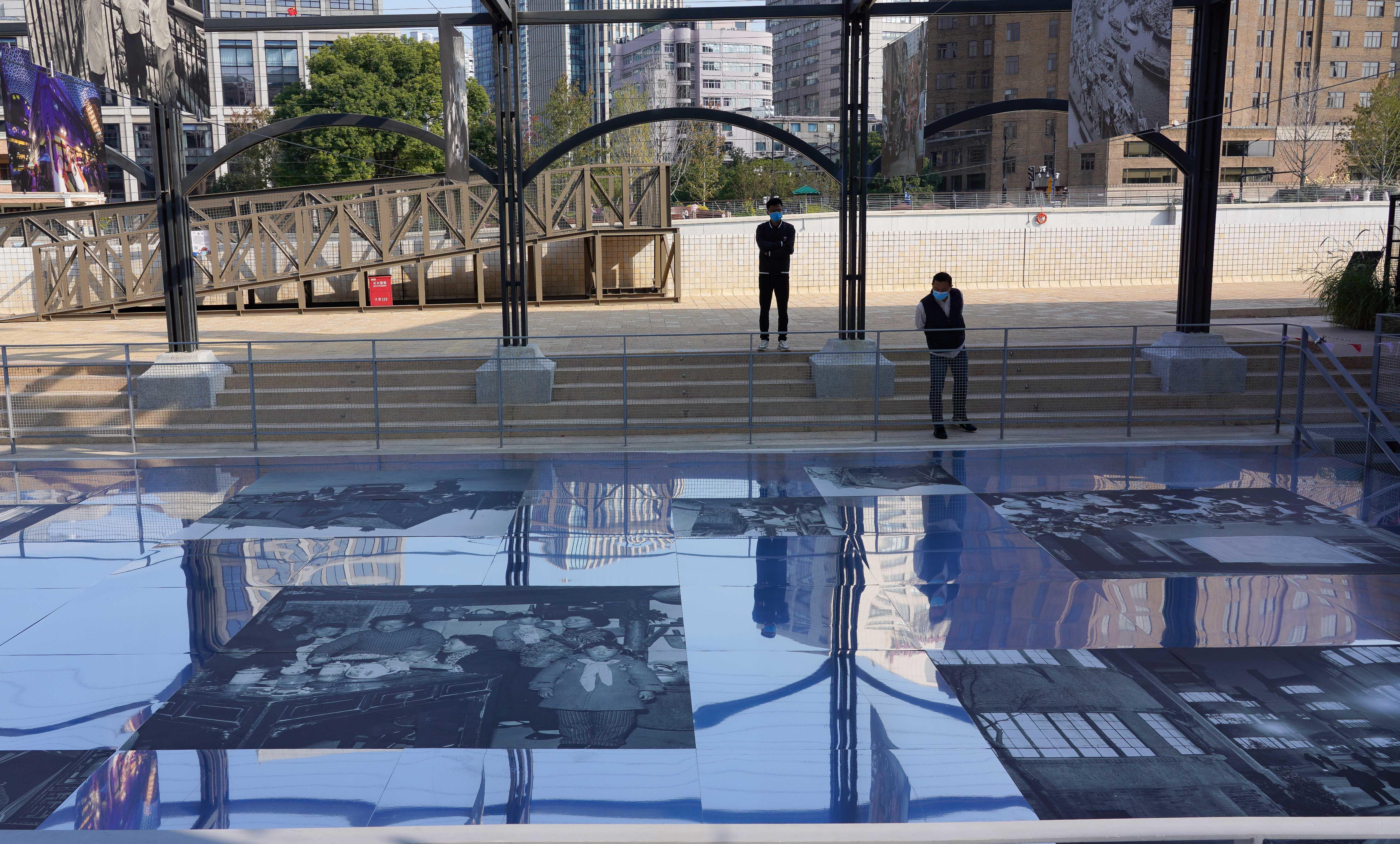 记者在现场看到,工人正在紧锣密鼓地施工中,本来空空如也的泳池里被一块块如同镜面的钢板铺平。一张张照片有的吊在钢架上,有的平铺在”泳池”水面,如同穿越时空遂道,在摄影暗房里的显影液里,回到了从前的那个年代。