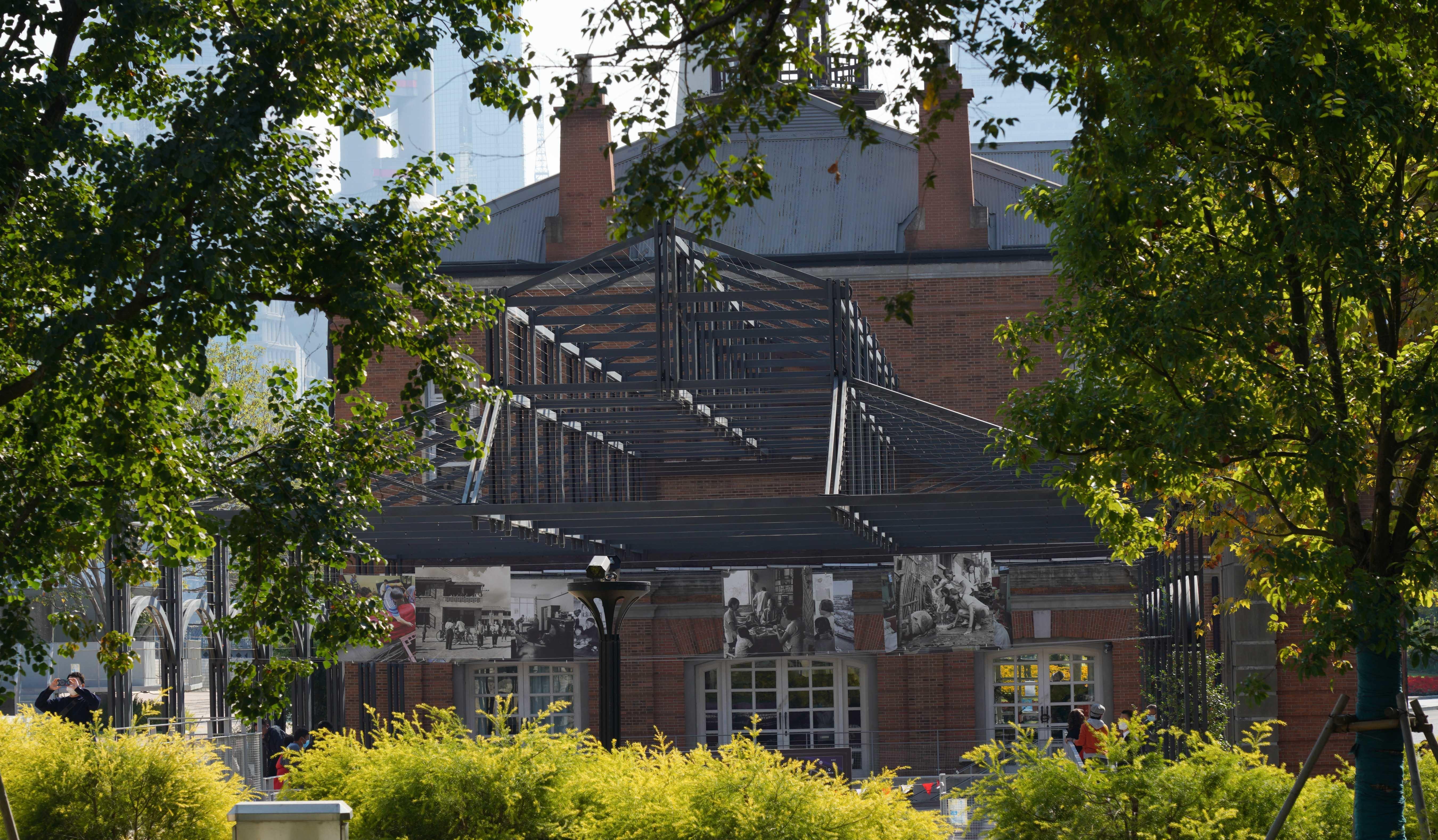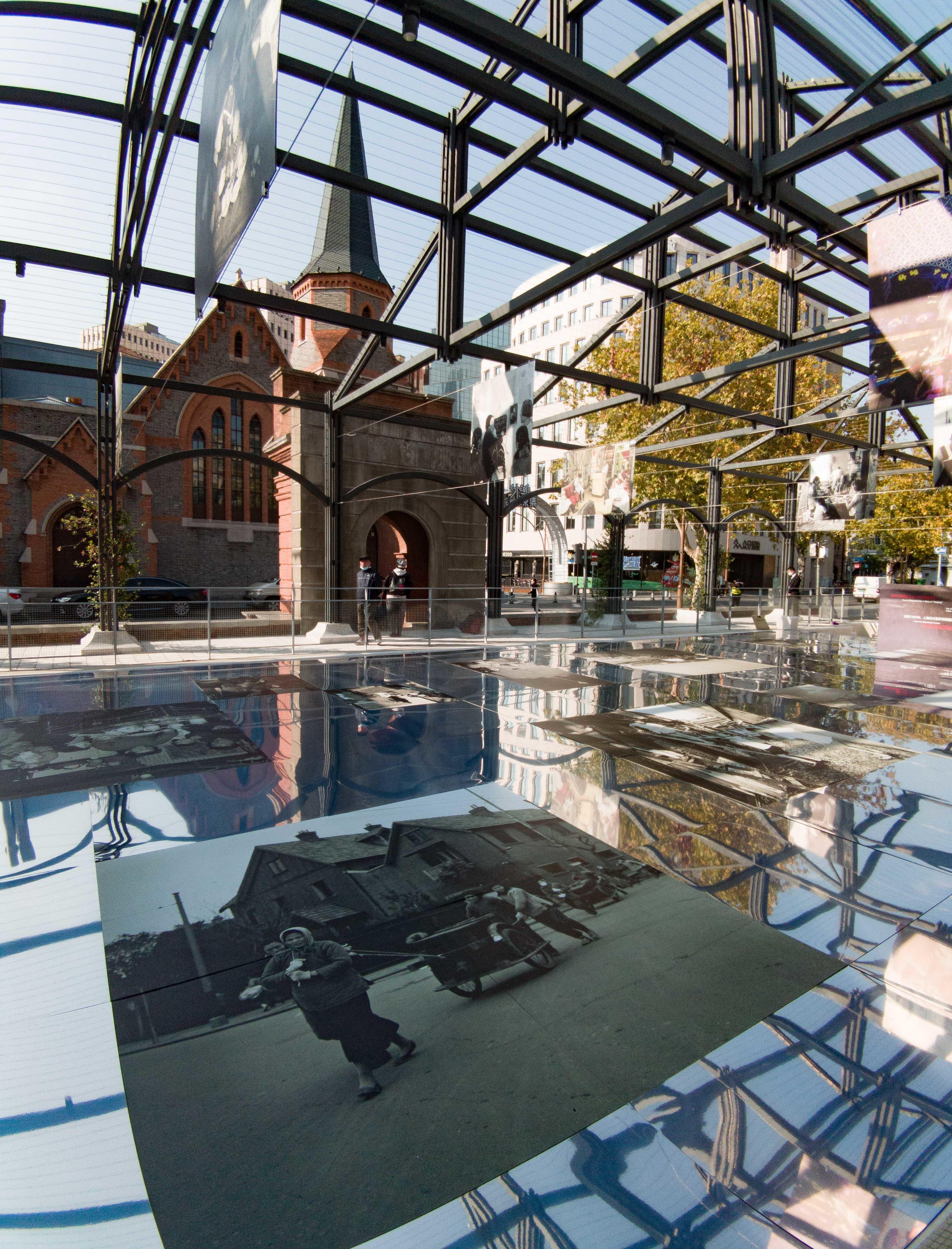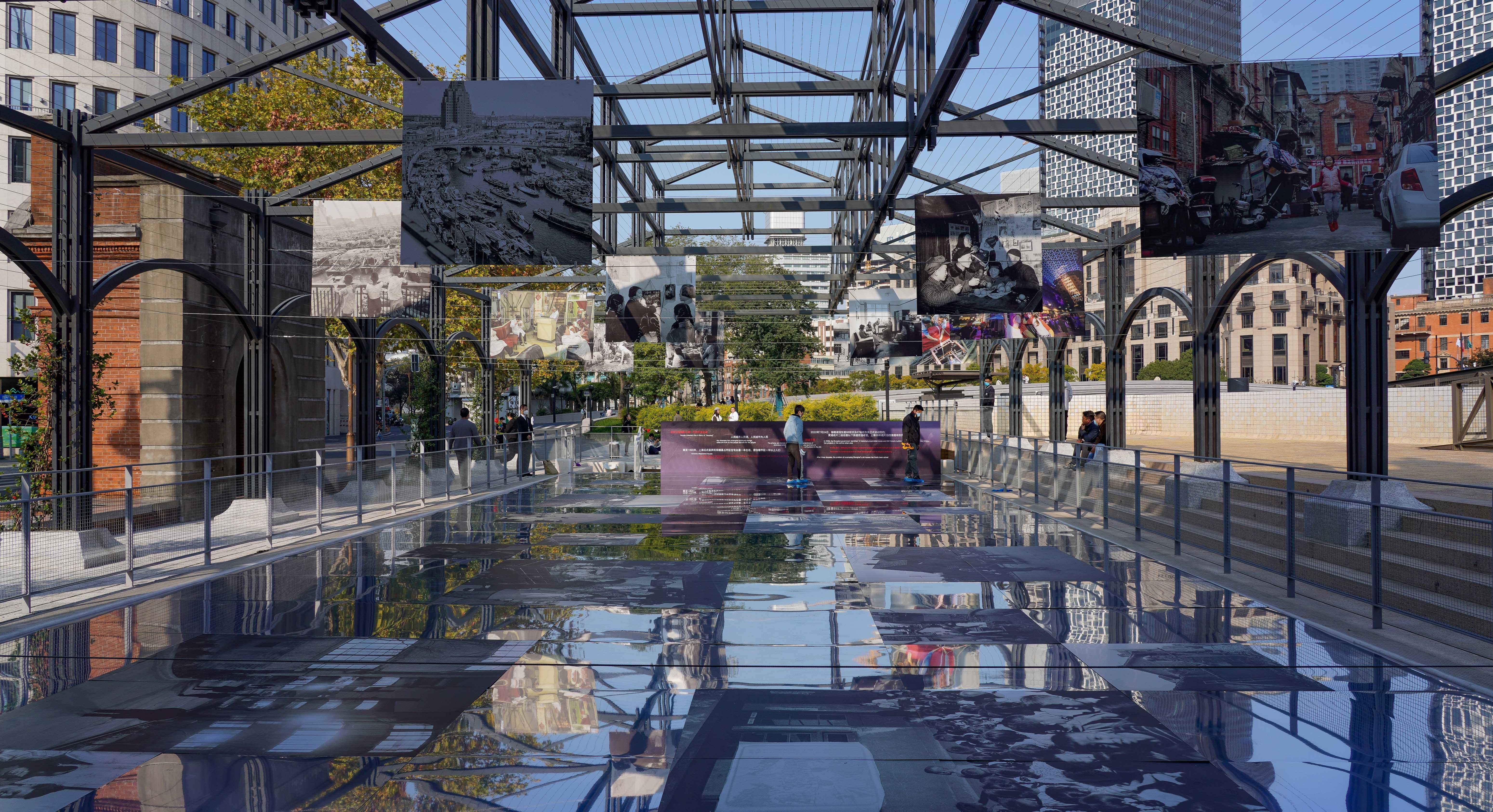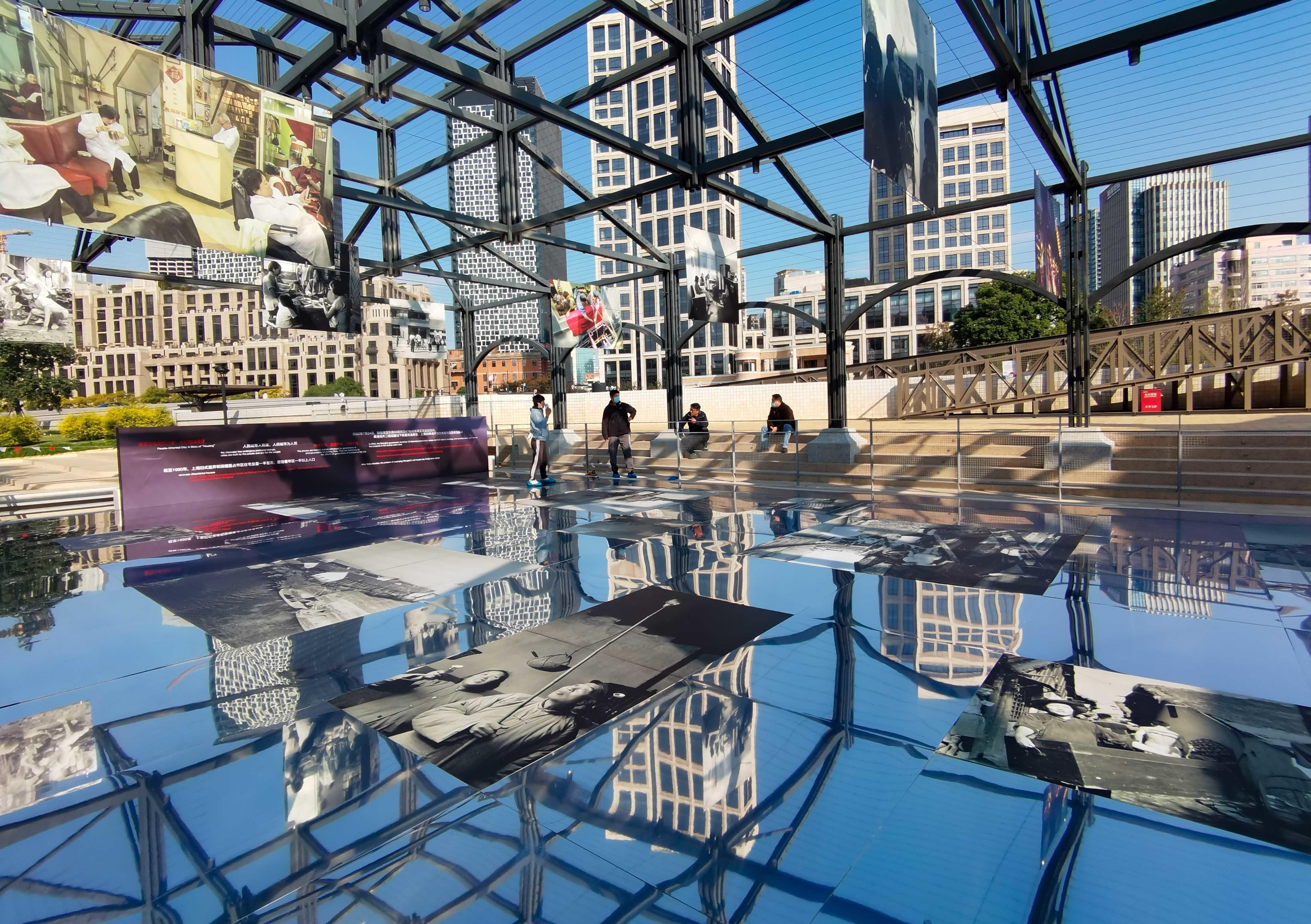记者在现场看到,工人正在紧锣密鼓地施工中,本来空空如也的泳池里被一块块如同镜面的钢板铺平。一张张照片有的吊在钢架上,有的平铺在”泳池”水面,如同穿越时空遂道,在摄影暗房里的显影液里,回到了从前的那个年代。