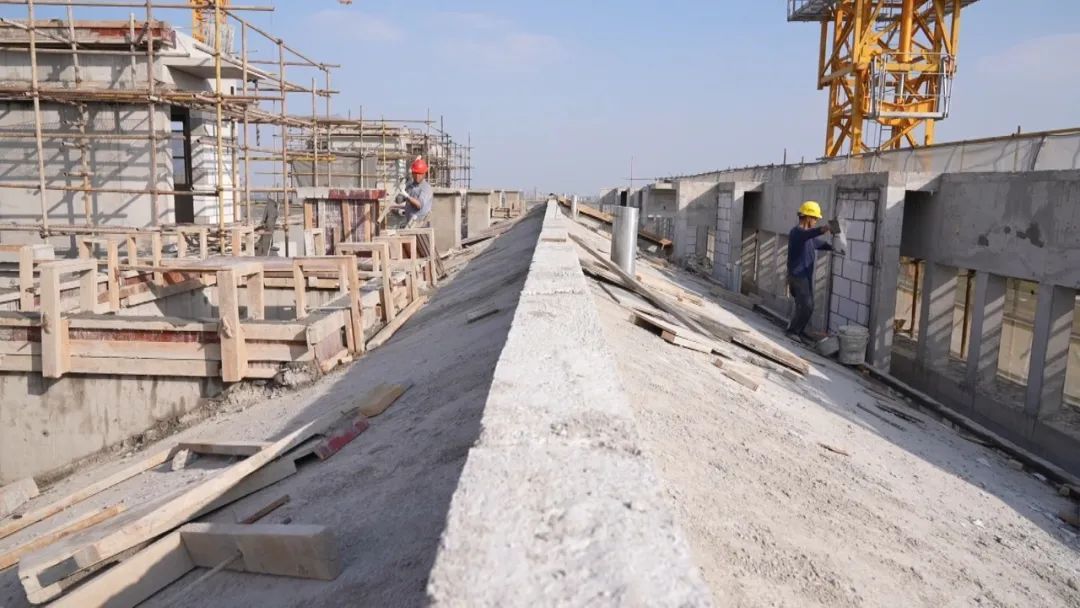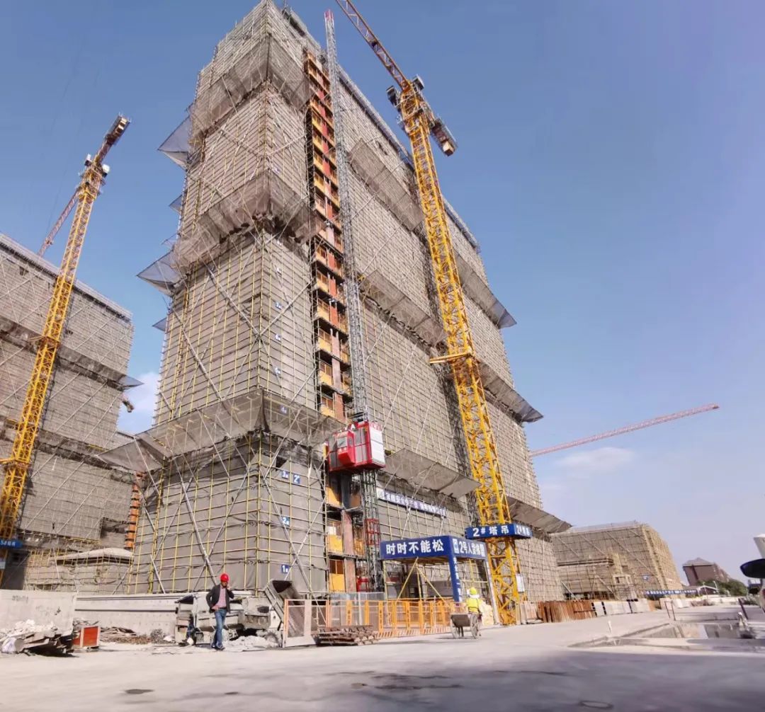 记者在现场看到,主体建筑前的塔吊正在有序作业,起降机起起落落忙着运输建筑物料,建筑工人正在顶层进行防水、保温等施工。部分楼层已经开始粉刷外墙。“消防、水电班组人员已经进场施工,预计下个月全面启动外墙粉刷。”项目经理万德科说。