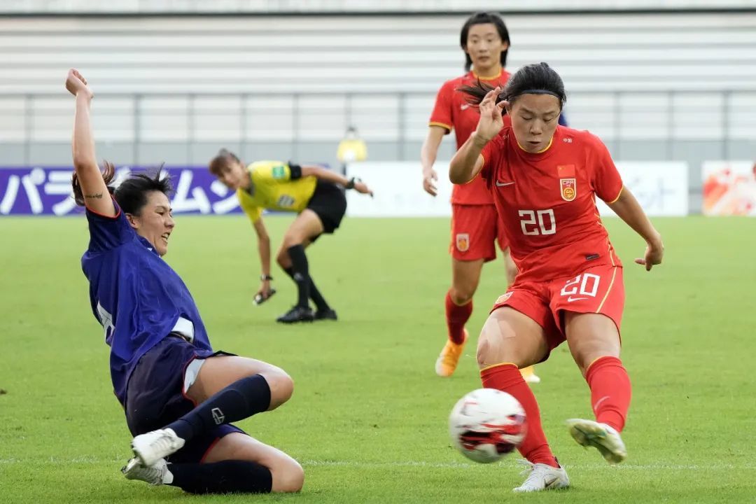 中国队球员肖裕仪(左二)在2022东亚杯女足比赛中带球进攻