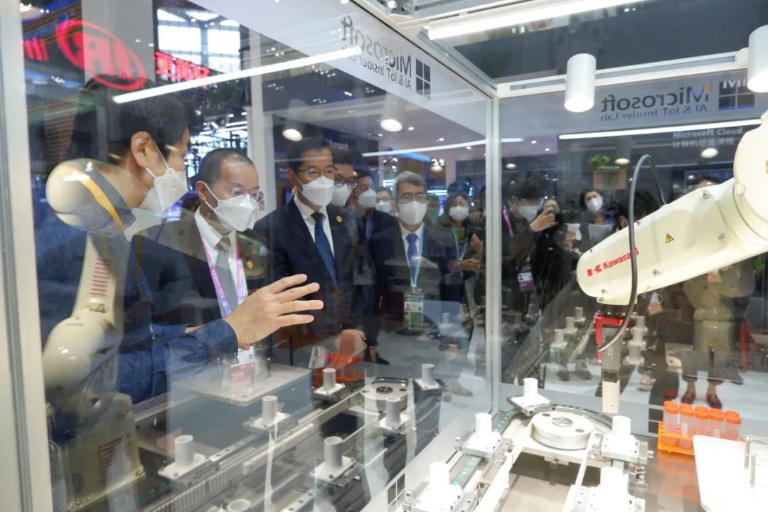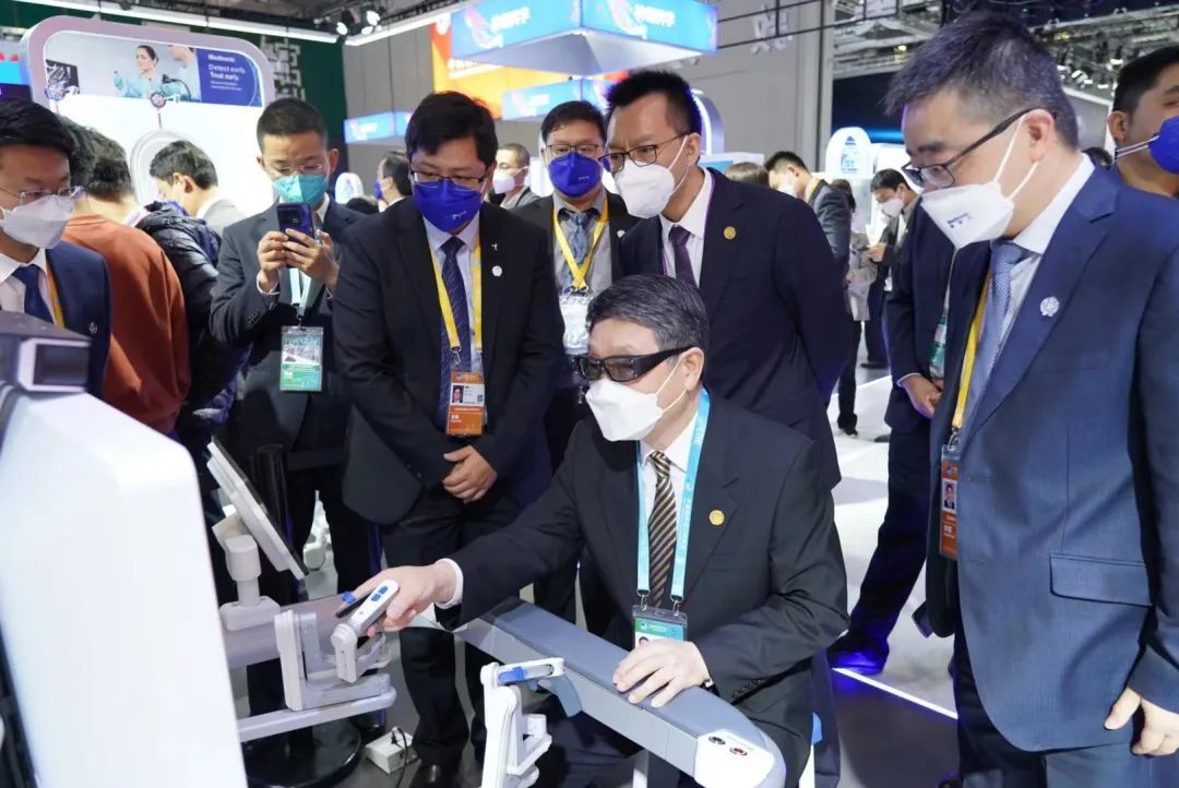 在美敦力展台,区领导亲身体验了美敦力Hugo RAS System 机器人辅助手术系统,该系统在进博会舞台完成“中国首秀”,与MAZORX 脊柱外科手术导航定位系统和Stealth Autoguide 神经外科手术定位系统联袂出场,绽放医疗人工智能的光彩。