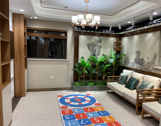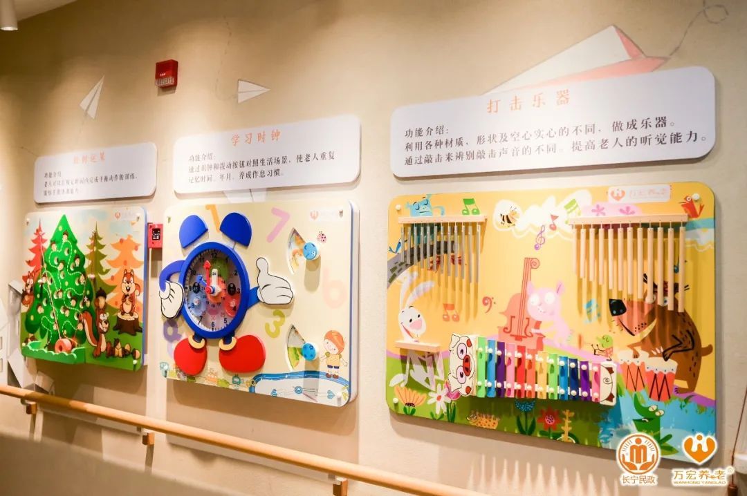 万宏悦馨养老院认知症照护专区,楼高5层,共有39张床位。每一层都别具一格地设计了不同的感官主题,置身其中,仿佛穿梭了时光,回到了过去。“认知症照护专区的建设,是以非药物干预治疗的康复理念,为患有认知障碍的入住长者提供针对性的认知训练和康复计划。”万宏悦馨养老院相关负责人告诉记者,认知症照护专区在长者所居住的楼层分别打造了游戏康复类、感统干预康复类、机能康复类等不同主题的活动空间,通过模拟家庭环境、绿植疗法、音乐疗法、艺术疗法、怀旧疗法等与药物相结合,延缓认知症发展进程,让老人重拾被“偷走”的记忆。