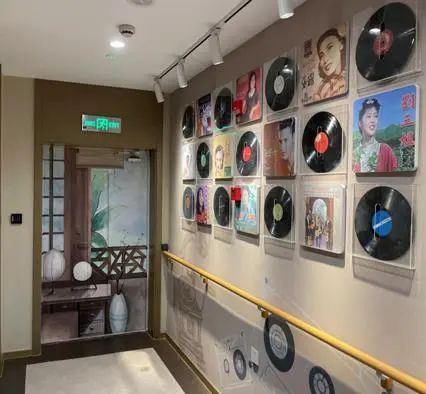 乘电梯到达2层后便进入了“双谊里”,白墙黑瓦假山绘就了江南园林水墨壁画,营造颇有意境的庭院式古典空间。公共区域的墙面上还整齐排列着老胶片和熟悉的电影海报,让长者产生强烈的兴趣,引起情感共鸣,触动回忆。