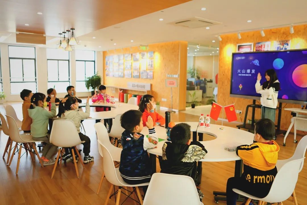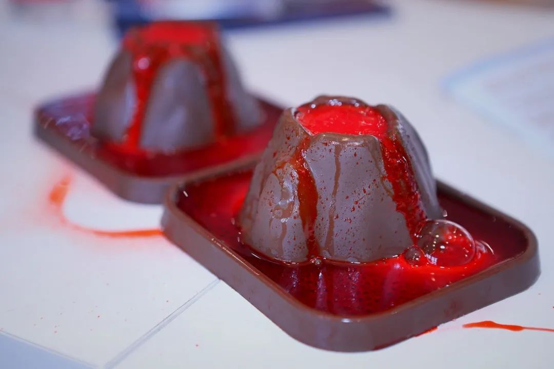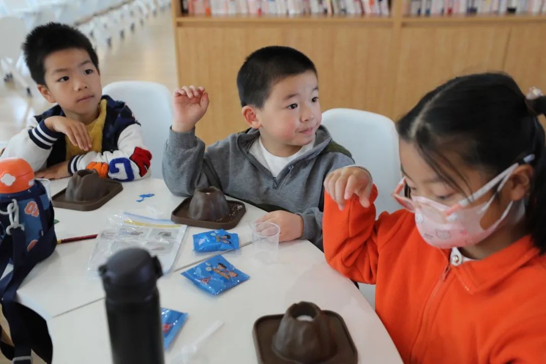 施老师给孩子们解释了火山喷发的原理,带领着小朋友们完成了“模拟火山喷发”的实验,当一座座“小火山”喷发出火红色的“岩浆”时,孩子们开心地笑了起来。