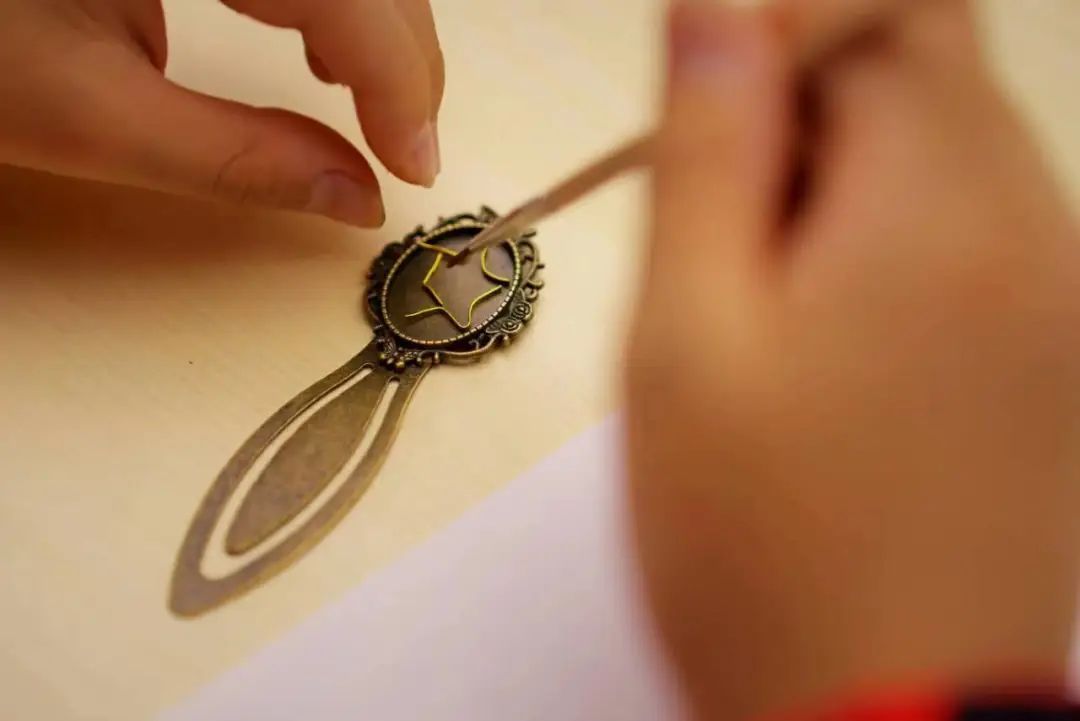 第一次接触珐琅制作技艺,孩子们小心谨慎、一丝不苟,聚精会神地将铜丝掐成设计的图案,然后进行填色。