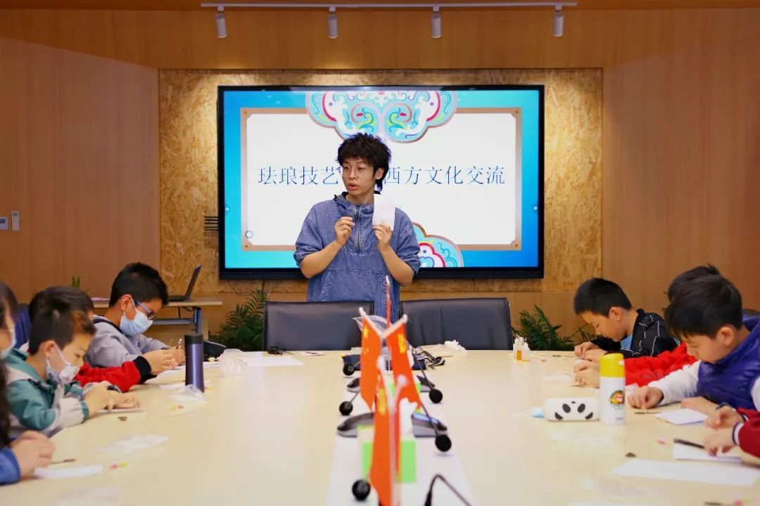 珐琅彩是中华传统文化中的重要艺术形式之一,也是“非遗”项目。陶老师详细地为孩子们讲述了掐丝珐琅器的发展历史及特点,并现场演示了设计、制胎、掐丝、点蓝等珐琅器制作流程。
