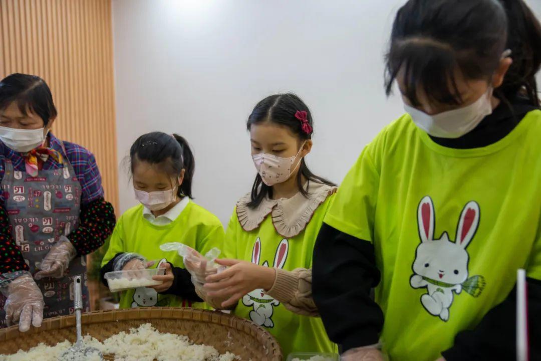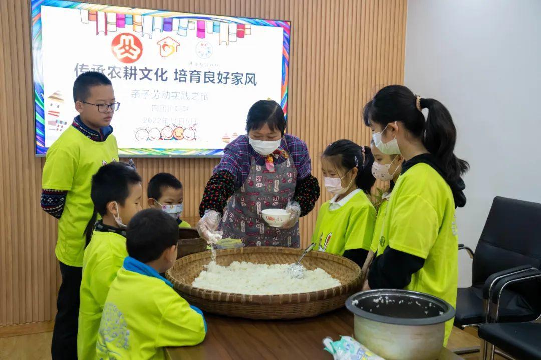 “那这个是什么呀?还要翻呀!做酒酿要好多材料!”离开田头,一场由大米变酒酿的“魔法秀”拉开了帷幕。大家好奇地围成一圈,孩子们此起彼伏的提问声和感叹声让现场好不热闹。看着奶奶娴熟地撒酒曲、翻米饭,孩子们也跃跃欲试,争当奶奶的小帮手,搅拌、装盒、留洞、加温水、盖棉被,忙得不亦乐乎。孩子们边忙活边想着,是从哪一步开始,这白白的米饭变甜甜的酒酿了,自己亲手制成的酒酿又会是什么滋味。随着孩子们满满的期待,农耕文化的体验活动也接近尾声。