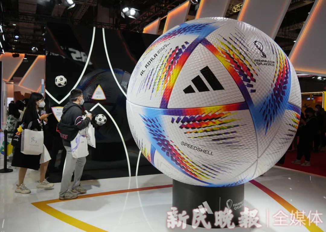 本届进博会阿迪达斯展区,2022年卡塔尔世界杯官方全新比赛用球——"AL RIHLA"逐梦之旅,特大号的足球成为本届展会亮点。新民晚报记者 刘歆 摄