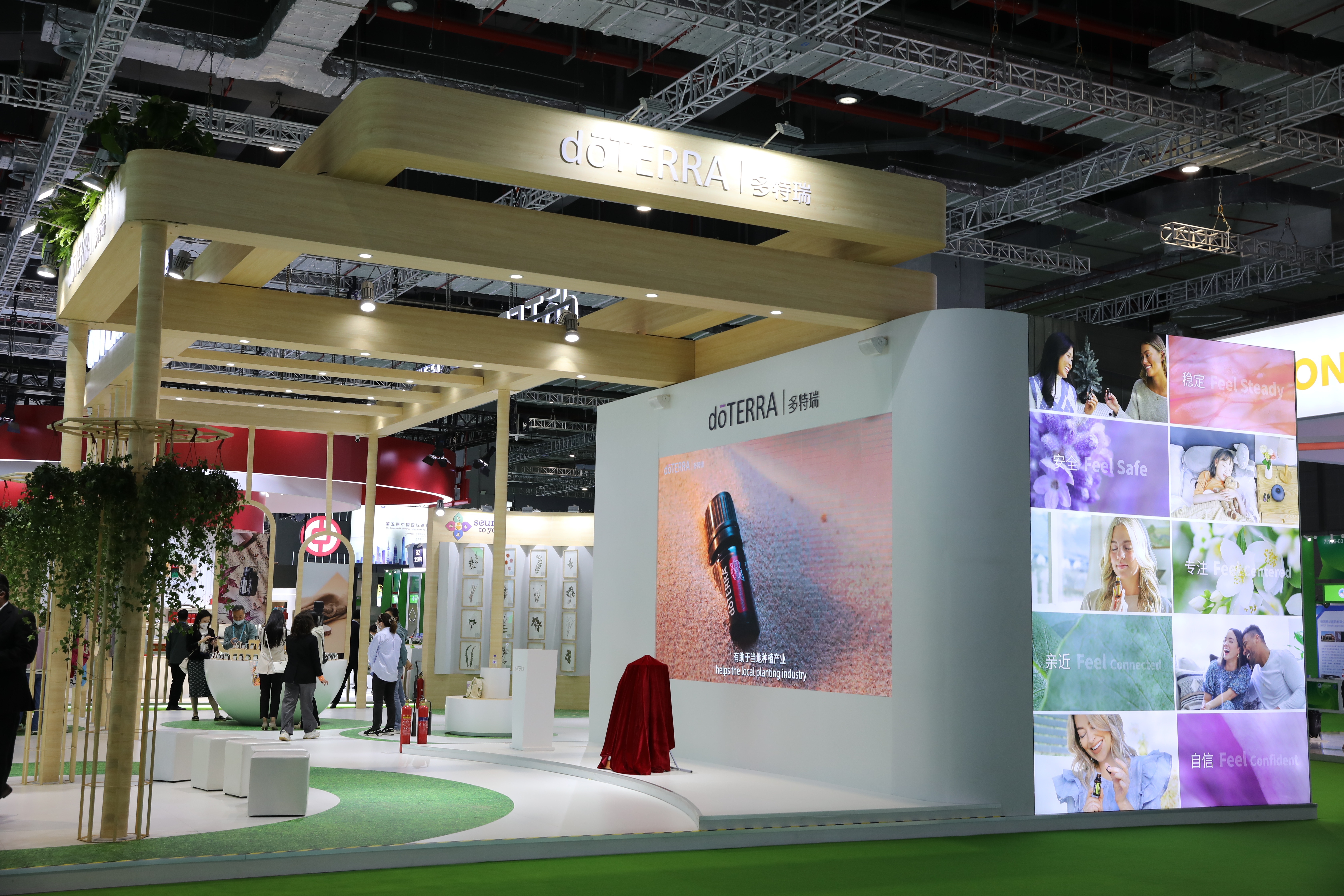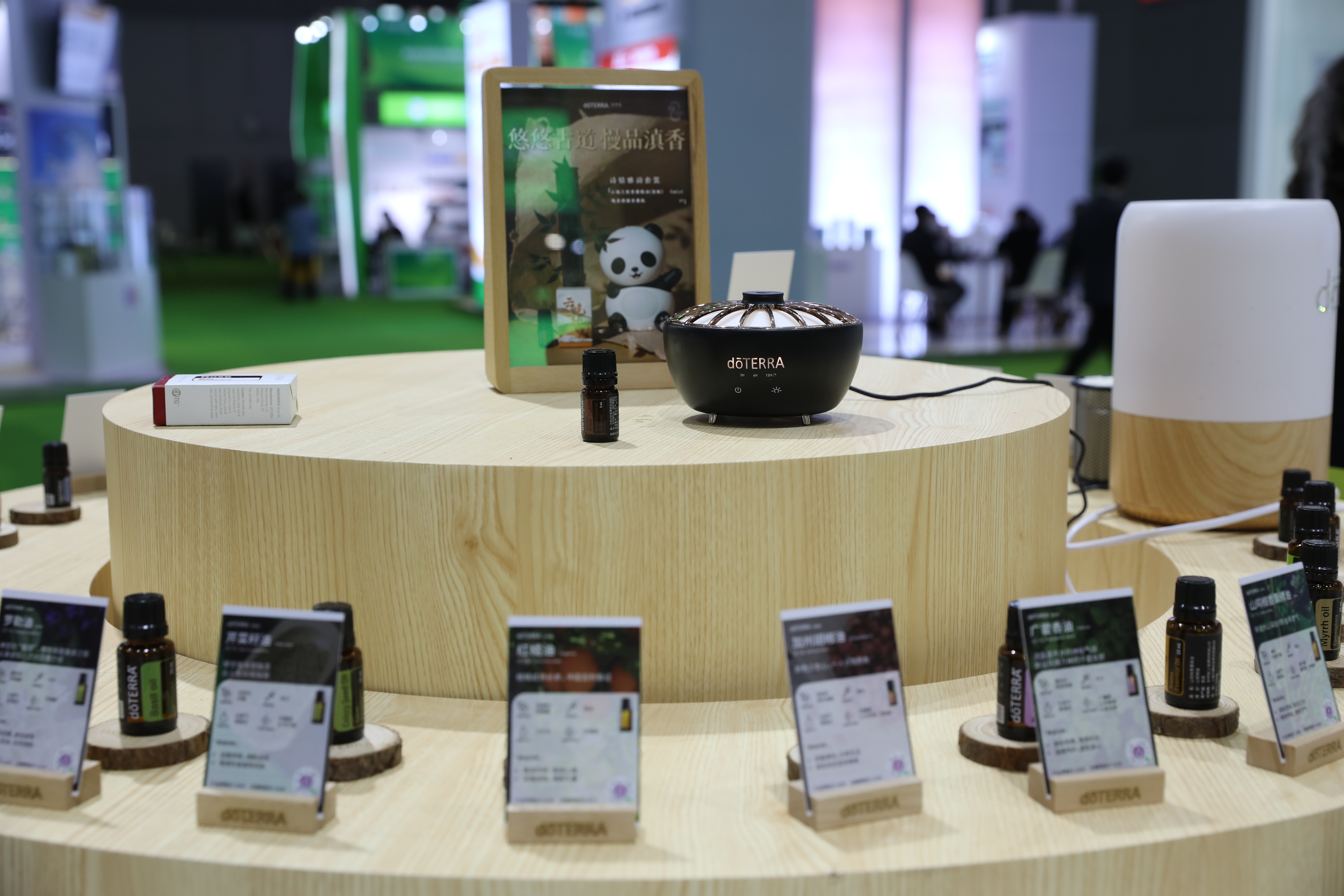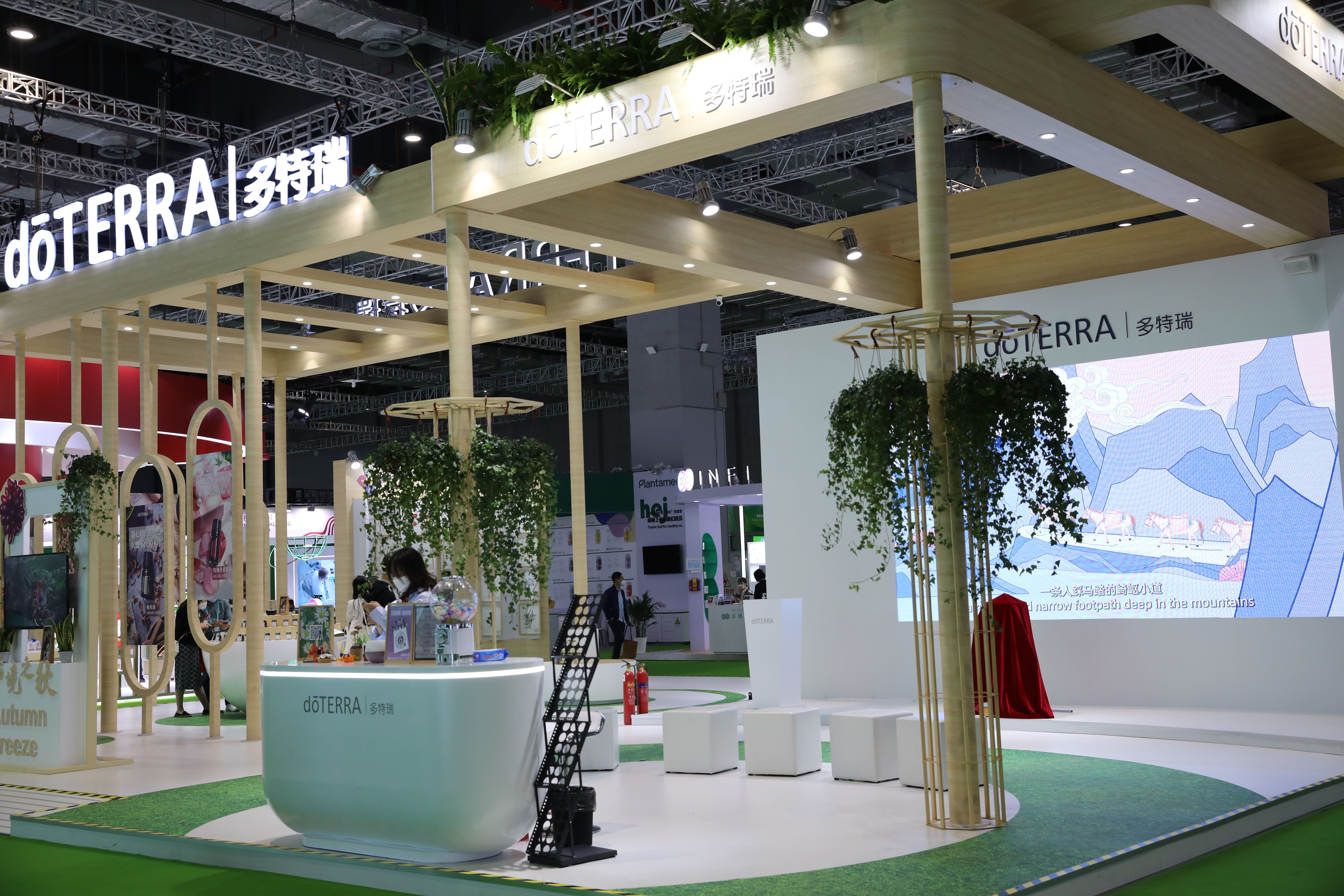多特瑞展台面积达200平方米,设计以多特瑞一贯的自然、绿色、环保的风格出现,并且专门辟出一片区域设立多特瑞“精油实验室”,开通线上直播间,讲解有意思、有中国特色的精油产品和有关精油生产环节包括种植、采收、萃取和检测全过程的知识。