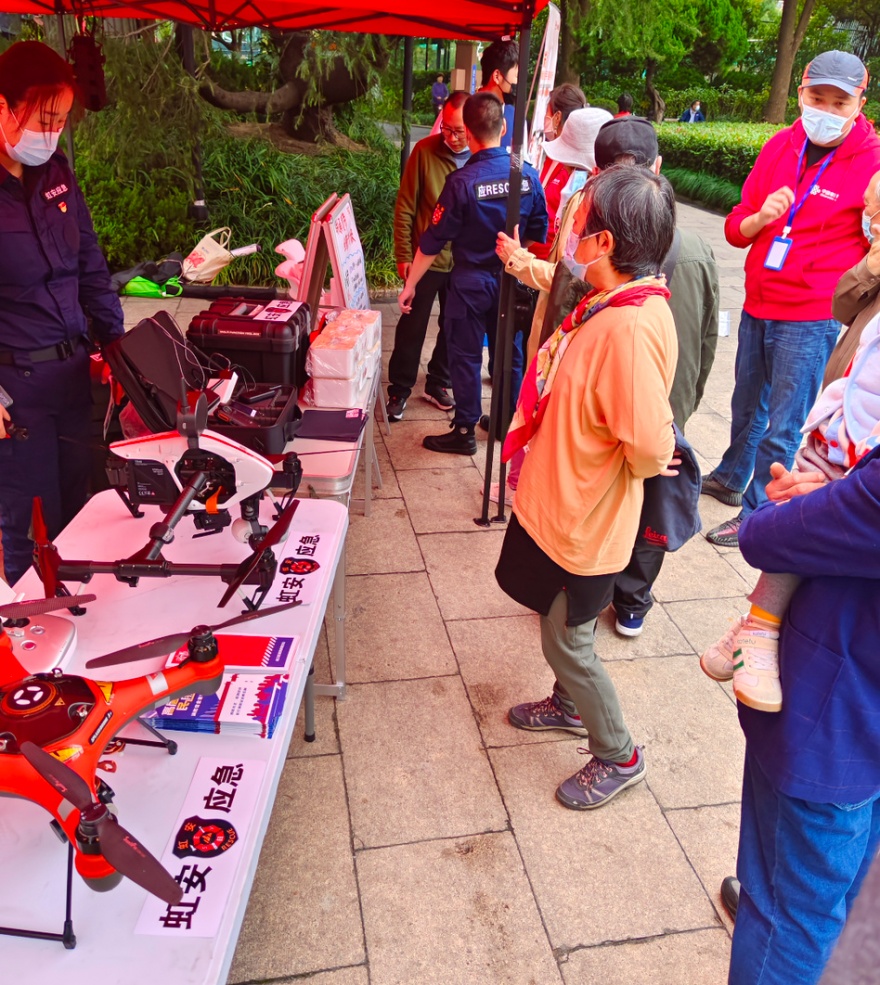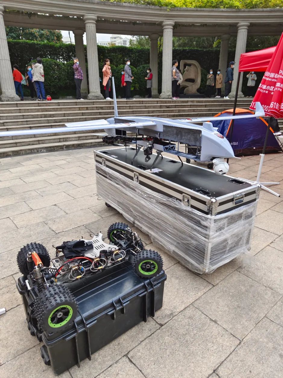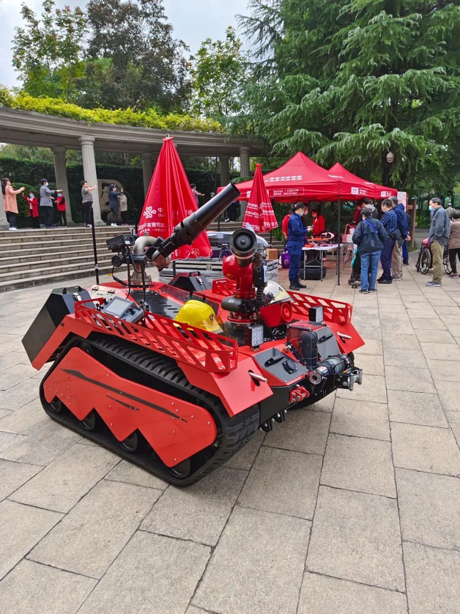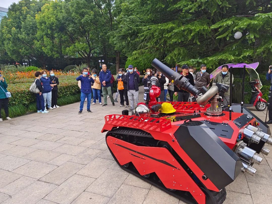 活动现场展示的消防灭火机器人、垂直起降固定翼无人机、全地形高速无人车、全天候救援无人机、家庭应急仓、高楼应急逃生包等在内的各类高精尖端科技装备,吸引了不少市民驻足观看。