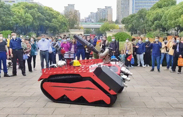 消防机器人是特种机器人的一种,可以应对复杂、危险的环境,在灭火和抢险救援中可以发挥重要的作用。工作人员现场操作消防灭火机器人前进后退、360°旋转、调整水炮角度,引得围观市民纷纷举起手机拍照、录像。