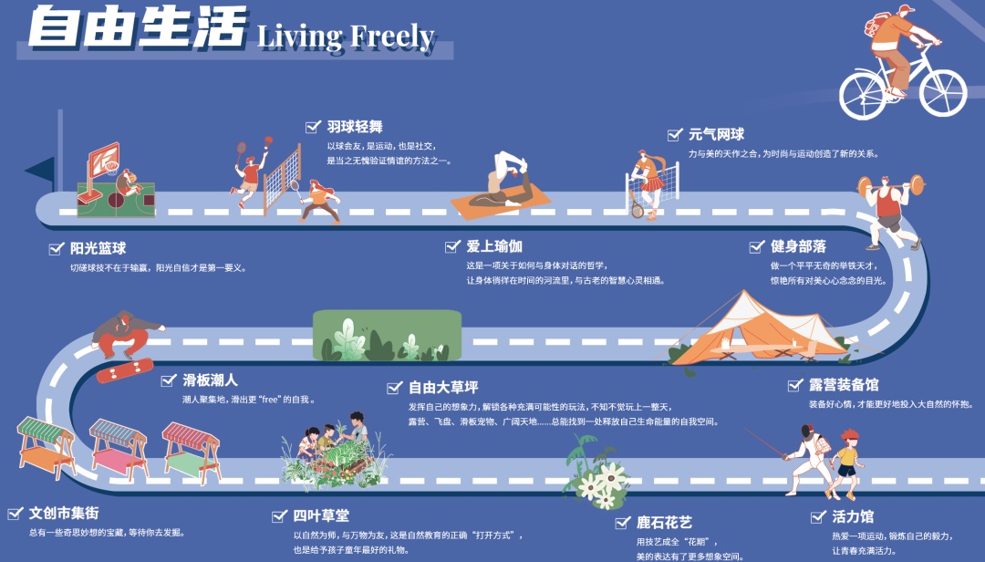 2.四叶草堂、滑板潮人、露营装备馆、自由大草坪、文创市集街:露营、飞盘、滑板、宠物、后备箱市集、文创、中古物件、自然教育课堂……快乐自己定义!