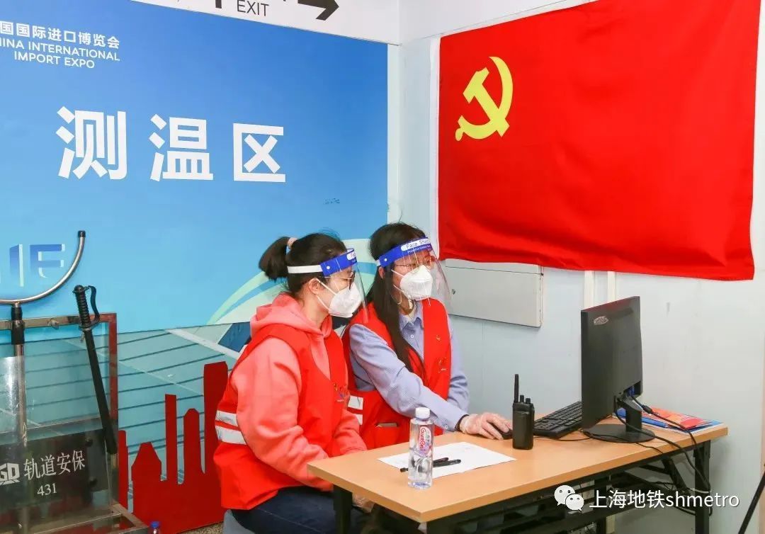 今年进博会期间,徐泾东站继续在3、4、5号口设立无感测温点,监测通行乘客是否佩戴口罩、是否体温正常。有召必应、使命必达,在党总支的号召下,2号线各支部党员、积极分子纷纷踊跃报名,每天12人次轮流上岗,自早上8点至下午14点,通过电子监控屏实时观察,发现有体温异常乘客及时处置并予以记录。