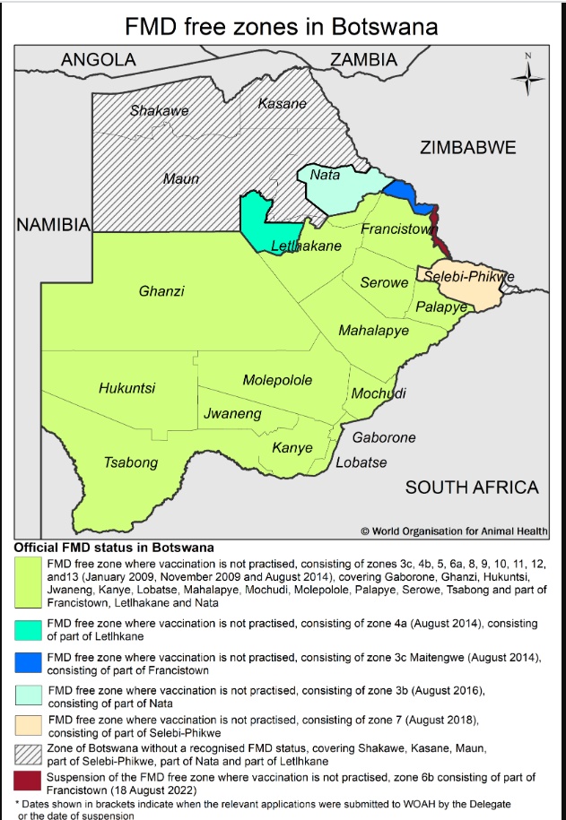 2022年9月21号,海关总署、农业农村部联合发布2022年第90号公告(关于取消博茨瓦纳部分地区口蹄疫非免疫无疫区地位的公告),为保护我国畜牧业安全,防止疫情传入,根据《中华人民共和国海关法》《中华人民共和国进出境动植物检疫法》及其实施条例等有关法律法规的规定,决定取消博茨瓦纳疫点所在区域(编号6b)的口蹄疫非免疫无疫区地位,禁止上述区域内偶蹄动物及其产品输华。