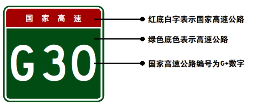 例如下图所示是我国的最长的一条高速公路G30连霍高速(连云港至霍尔果斯高速公路)的标识。其上方是红底白字,标识“国家高速”,连霍高速是一条东西横线,下方编号为国道标识符G和两位偶数30。