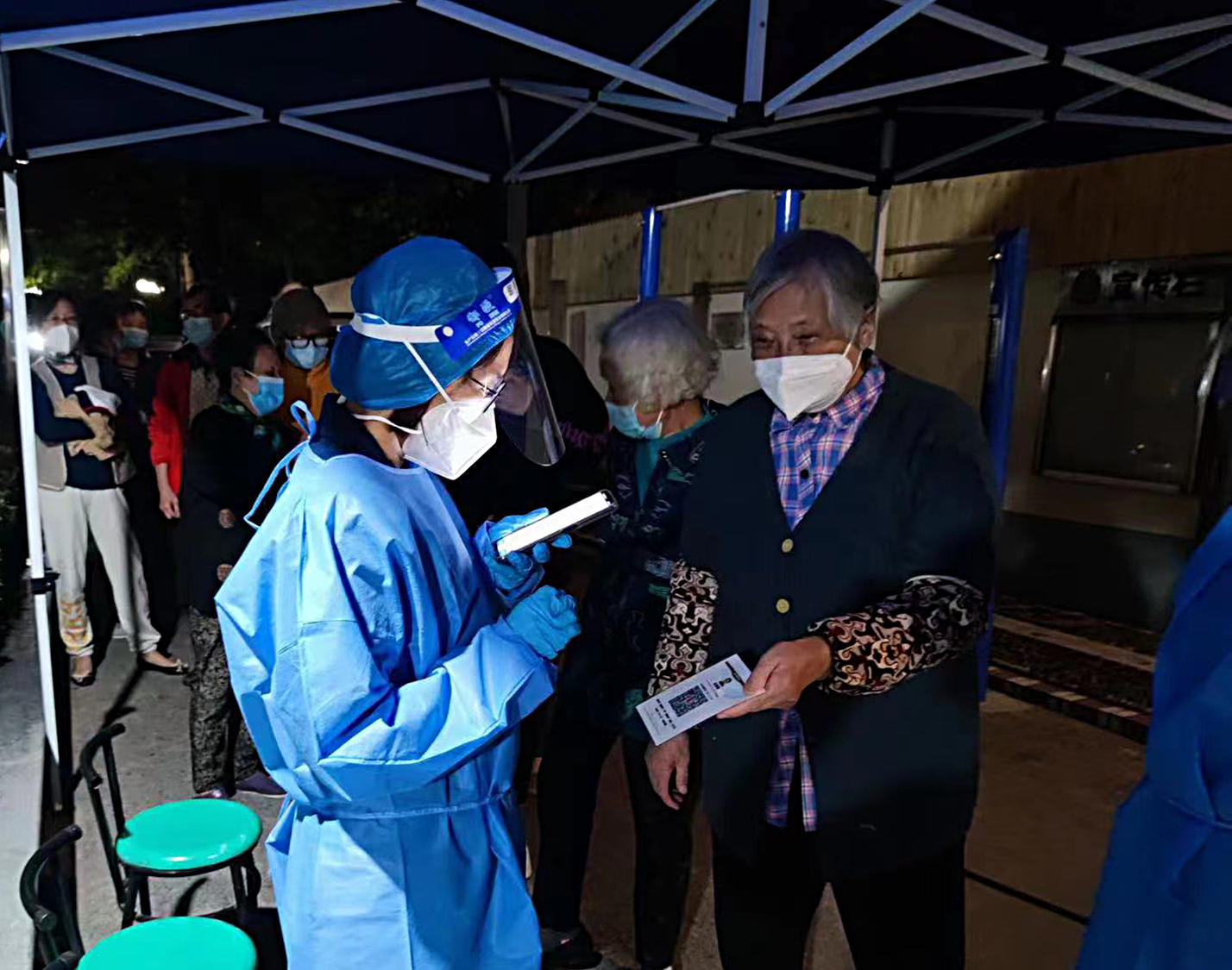 南塘居民区党总支书记郭争则表示,许多前来的结对党员大多有类似林检察官的防疫志愿经验,但由于从事的分工不同,居委会依然会在党员们前来报到后,对其进行科学详细的社区大筛工作流程科普及专业培训。“今天,林检察官主要负责为此次社区大筛进行人员信息登记,除了需要穿上厚重的防护服,她还需要随时保障被检测人员身份与登记信息一致。而面对使用打印二维码、身份证进行登记的老年居民,则需要格外的耐心。”