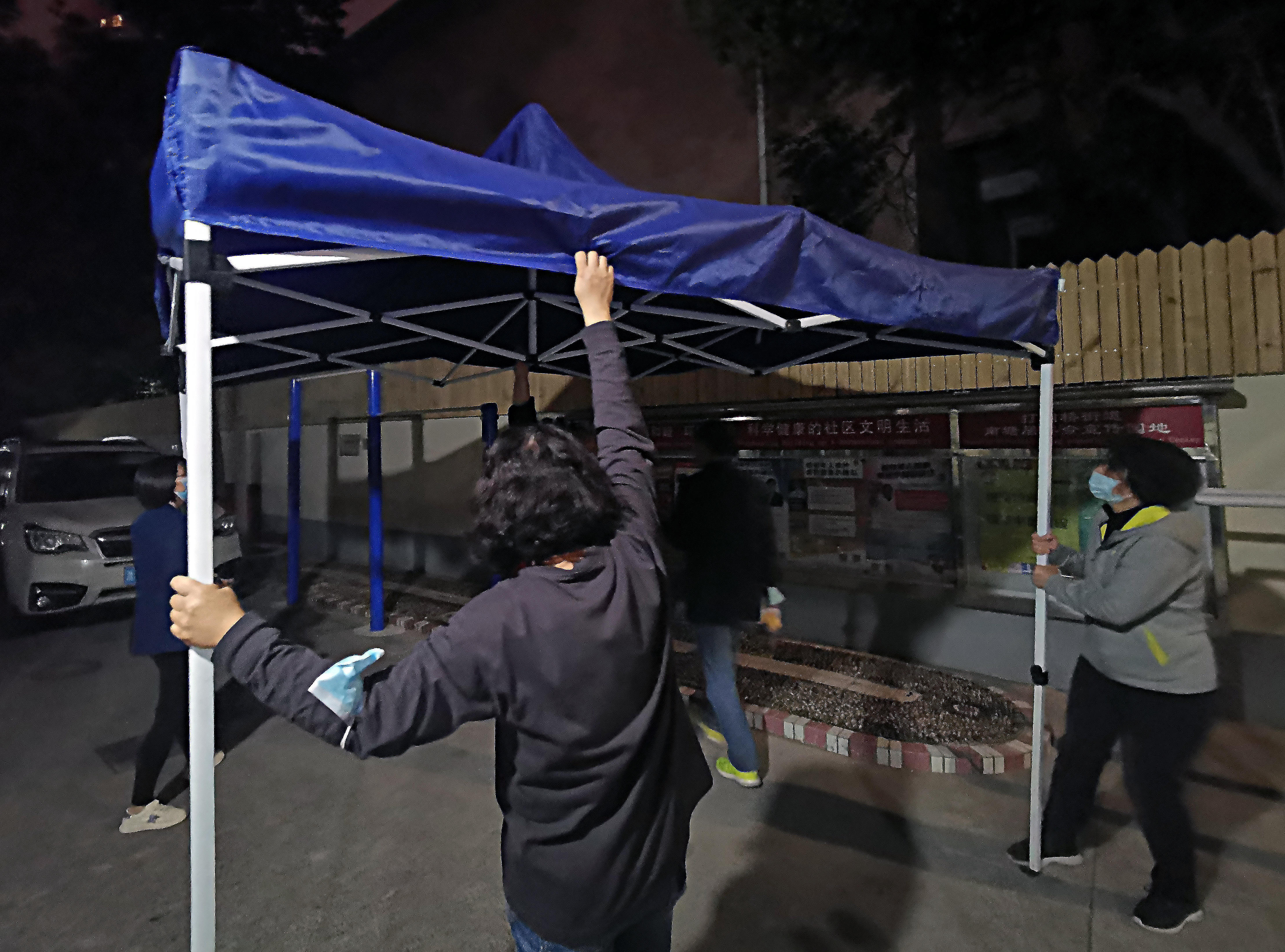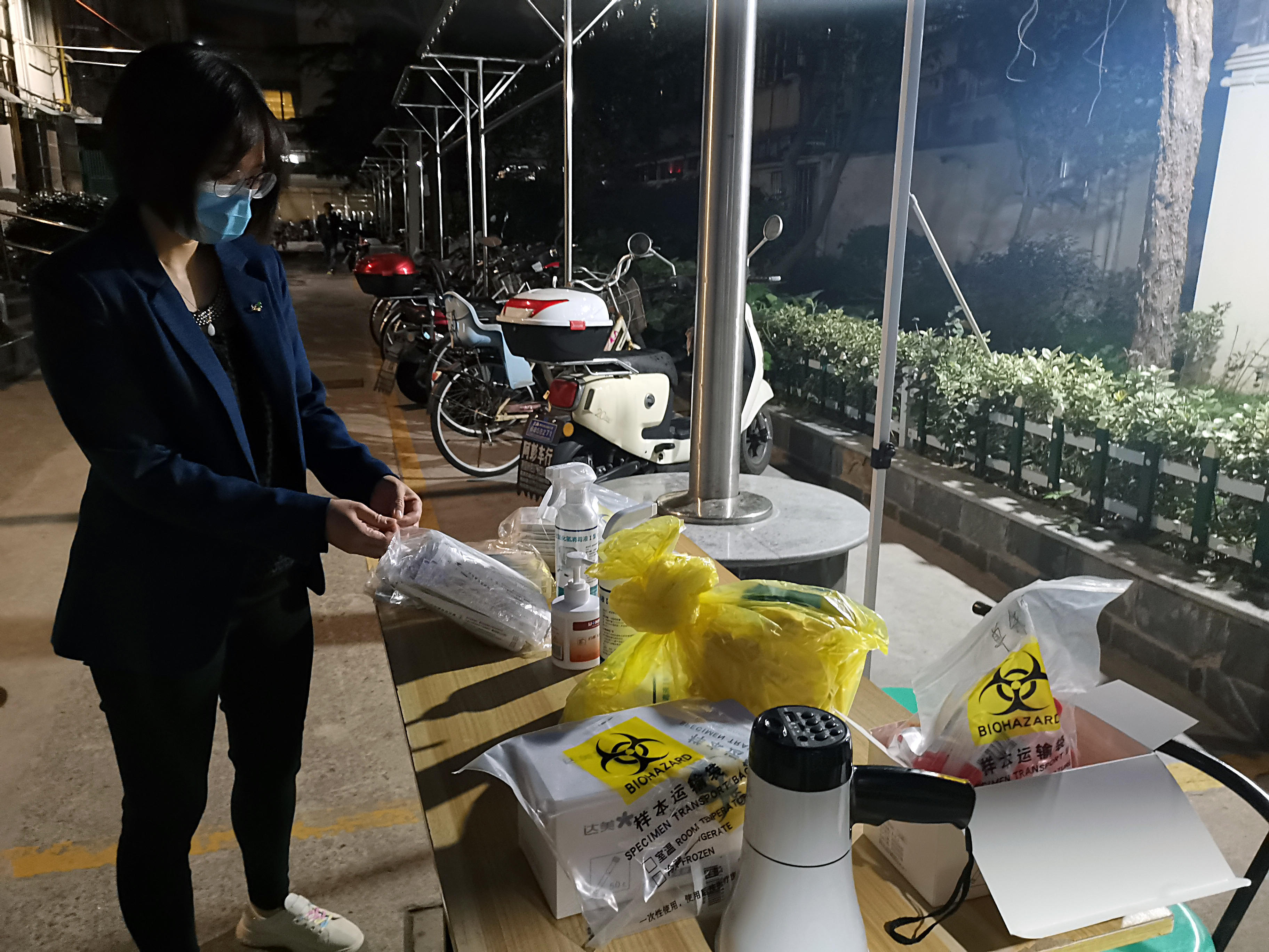 某个工作日晚上五点刚过,一阵阴雨飘落,一位来自第四检察部的检察官林玲风尘仆仆地赶到南塘居委会办公室。原来,这位林检察官是为了协助居委做好社区大筛工作,特地提早来为大筛前的准备环节出人出力。为了保障社区大筛工作有序进行,不受天气影响,现场提早搭起了雨棚,由“大白”和“小蓝”们负责引导居民沿着小区指定路线由东向西有序排队,不走回头路。除此之外,照明设备、电音喇叭、试管试剂、消毒用品、防疫装备也必须提前“悉数到场”。