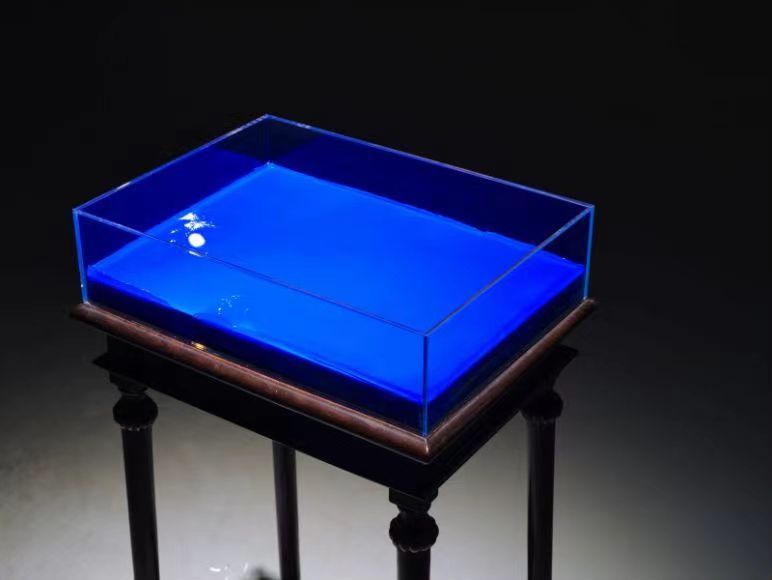 《克莱因蓝(生物)》作品,是运用合成生物学技术,培育与转基因结合促使微生物酵母菌群生长成的一种在生物体中非常罕见的绚丽蓝色,它还长满分布在展厅空间中的墙面上。