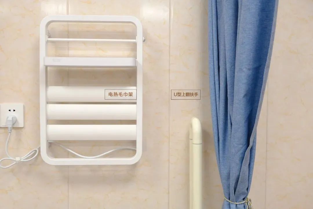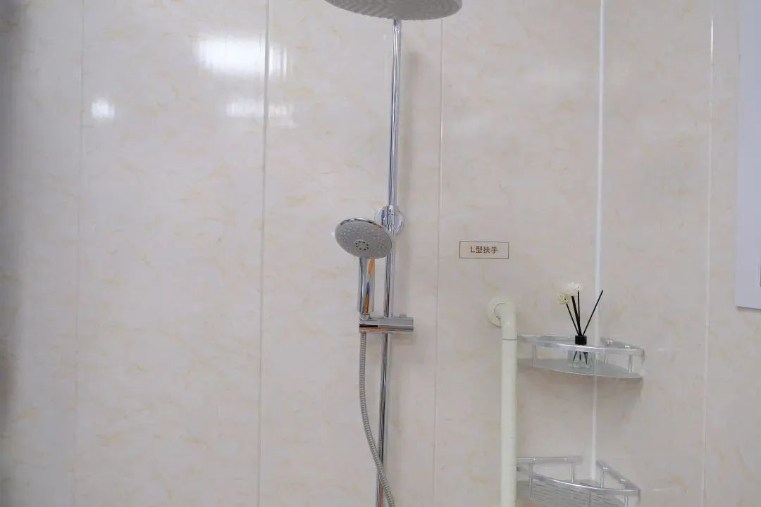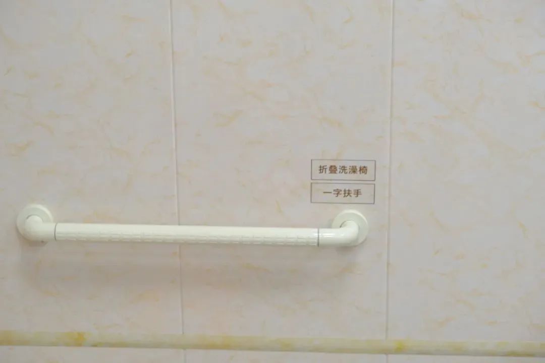 卫生间新增了一字扶手、U型扶手、L型扶手三个多功能扶手,分别位于马桶旁、毛巾架旁和花洒一侧。淋浴房里,地面做了防滑处理,还添置了一把可折叠座椅,方便老年人进出,坐着轮椅都可无障碍通行。