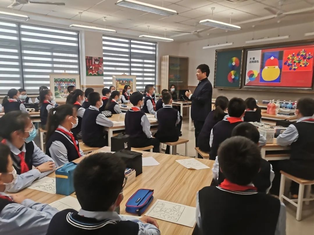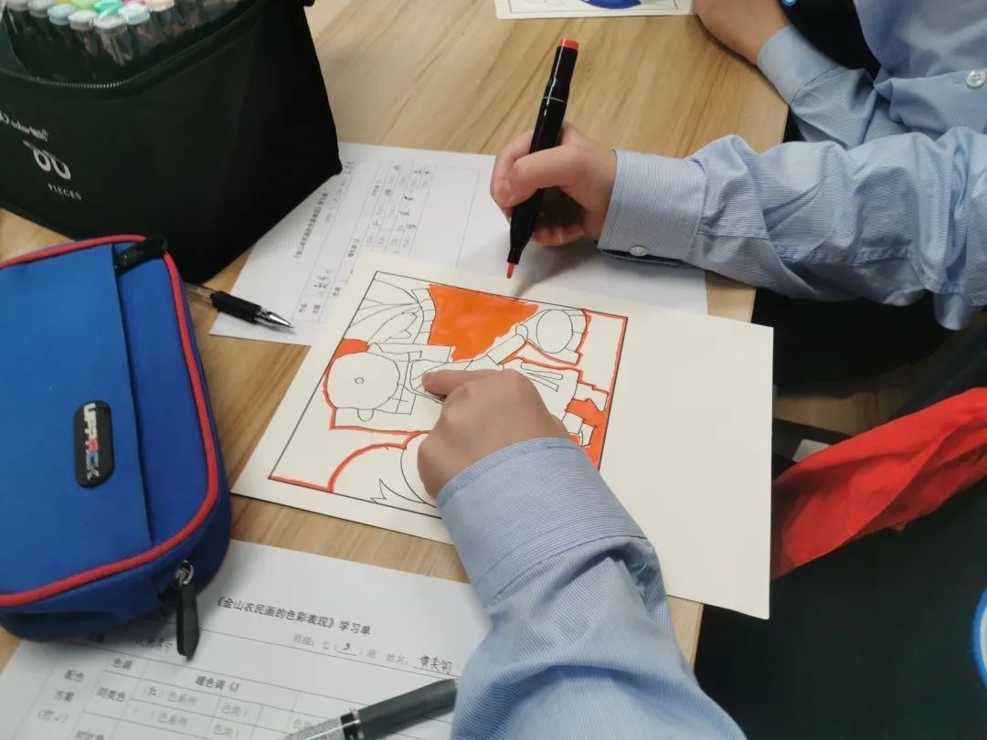 今天这节课,我教授了学生金山农民画的用色技巧。学习了金山农民画的用色方法后,还可以延伸并运用到生活中,这是非常有教育意义的。