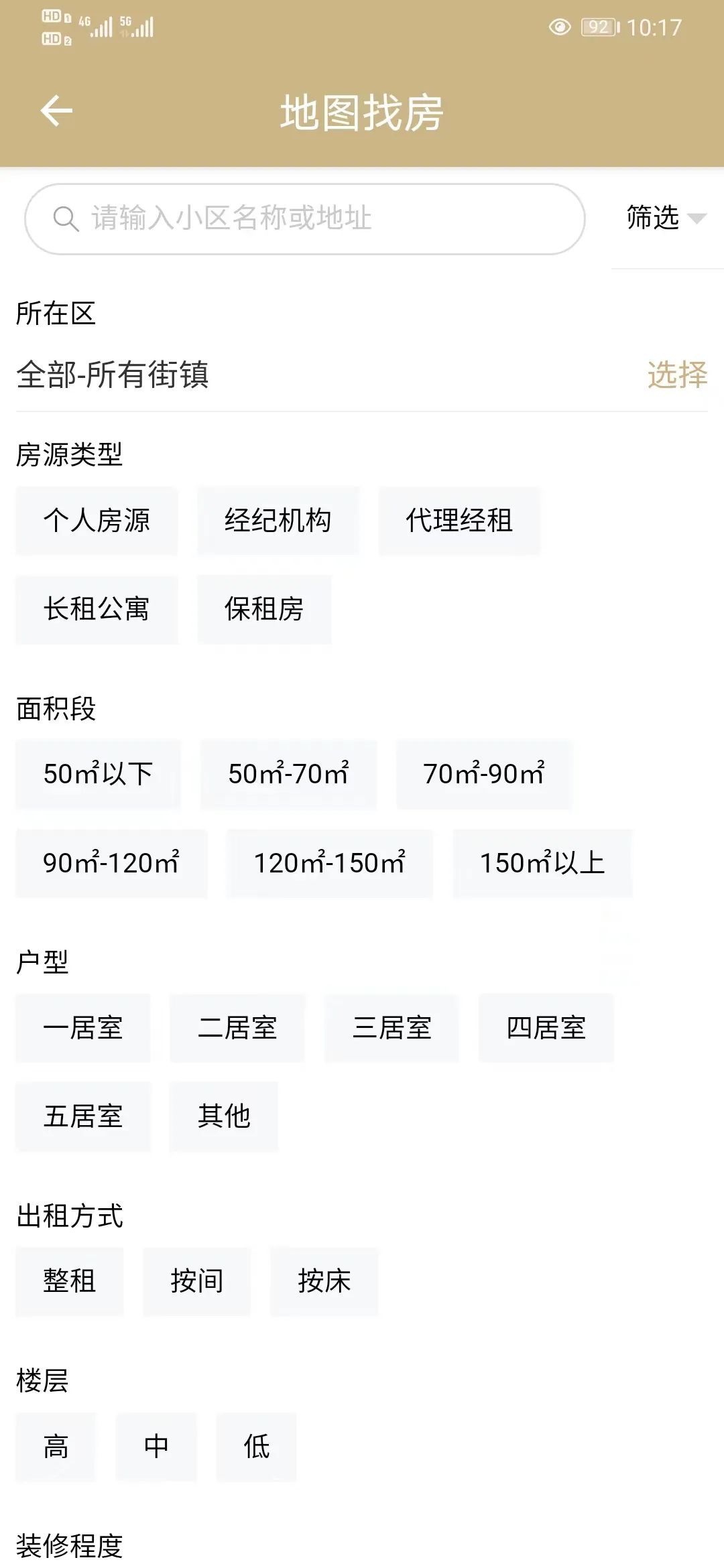 4、也可点击“筛选”按钮进入高级筛选页面,丰富更多筛选条件:出租方式、楼层、装修程度和租金,精准筛选到你最为心仪的房源。