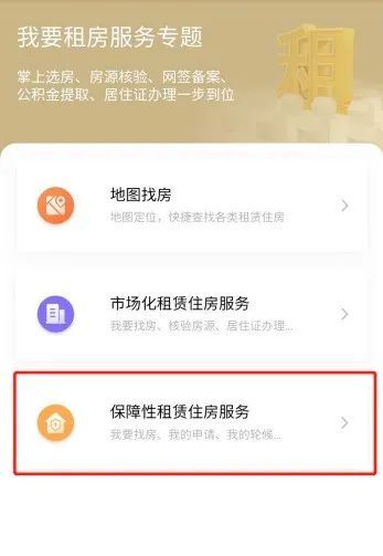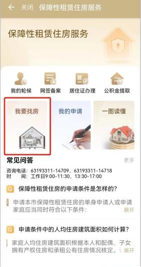 1、打开“随申办”微信小程序、“随申办”APP或支付宝小程序,首页搜索进入“我要租房”,选择“保障性租赁住房服务”。