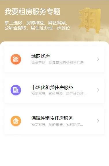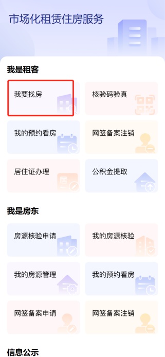 包括我要找房、核验码验真、我的预约看房、网签备案注销、居住证办理、公积金提取等服务事项,点击对应选项即可进入相应服务。