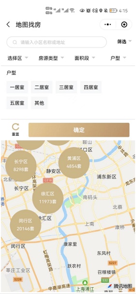 2、支持行政区、街镇、小区的地图筛选,可通过点击圆圈或放大缩小屏幕进行操作,查看相应范围内的房源数量与信息。