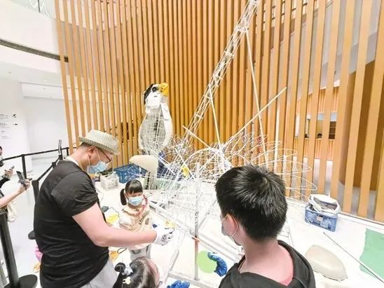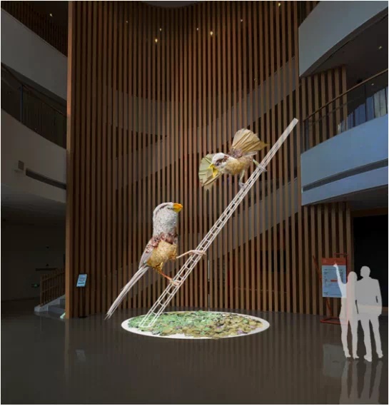 走进剧场一楼,这里展陈的是大型生态时间艺术装置《哺育》。这一由上海戏剧学院教授徐国峰创作并带领团队实施的艺术作品,创作灵感来源于《中国珍稀物种》纪录片中震旦鸦雀喂食的感人瞬间。以崇明东滩代表性鸟类、国家二级保护动物、全球性近危物种“鸟中熊猫”震旦鸦雀为视觉主体,构成元素为废弃塑料垃圾,由艺术家带领自然爱好者及艺术爱好者现场共同制作,过程将会在现场同步呈现,直至作品完成。整个展期期间,《哺育》将不断生长,于11月27日呈现最终形态。
