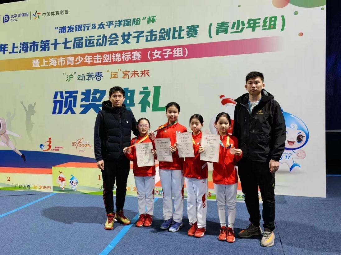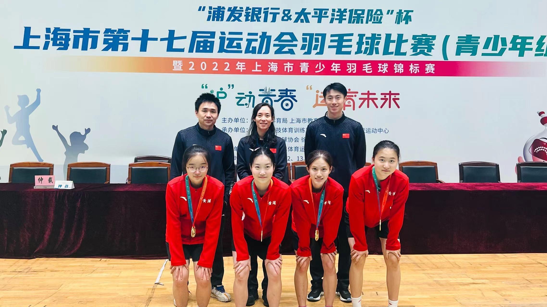 在羽毛球团体赛中,由寿裙喻、罗盛萱、于倍懿、孙俪洋组成的黄浦区羽毛球队女子A组经过激烈角逐,获得团体第一名,为黄浦区再添一金。