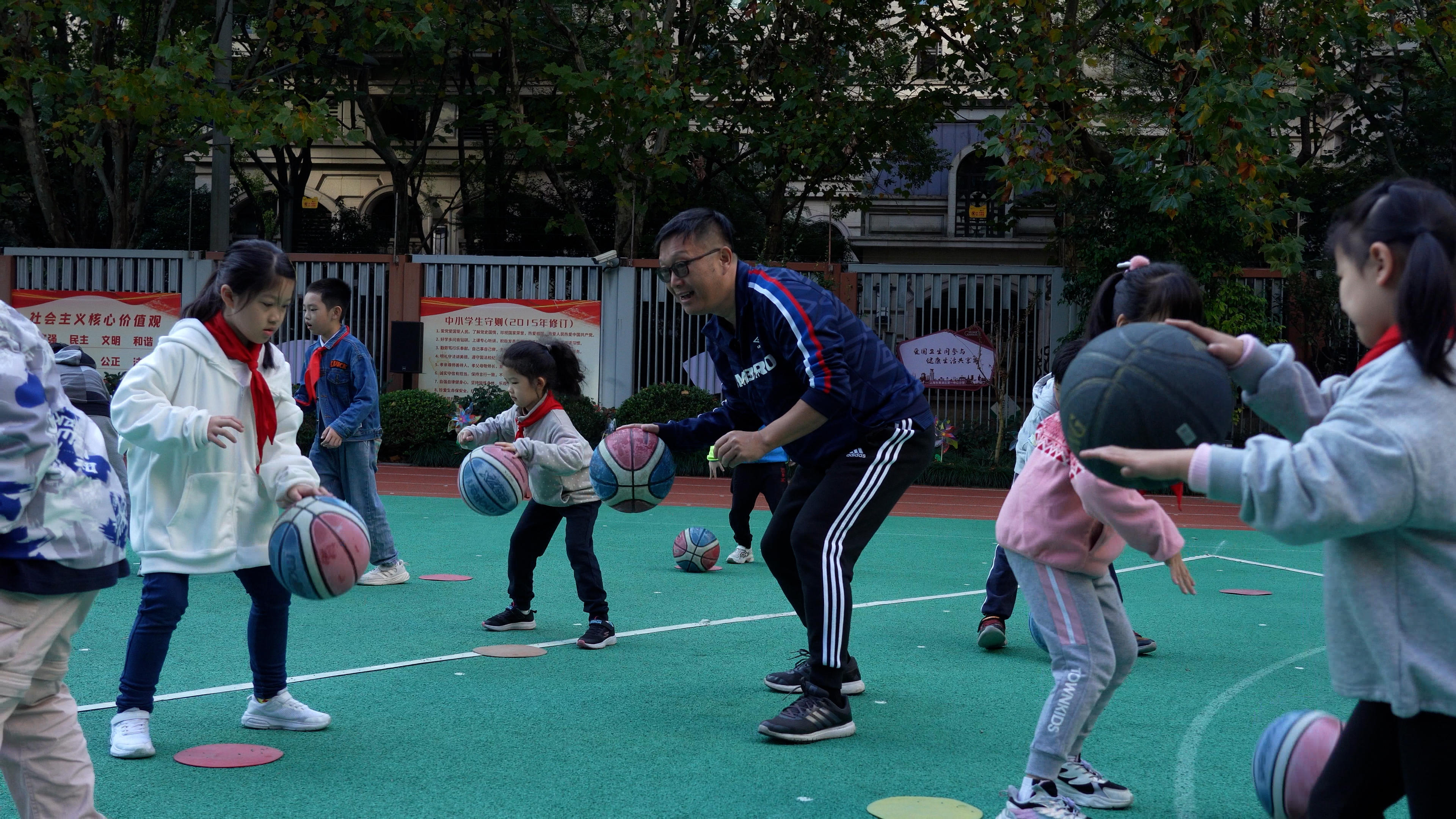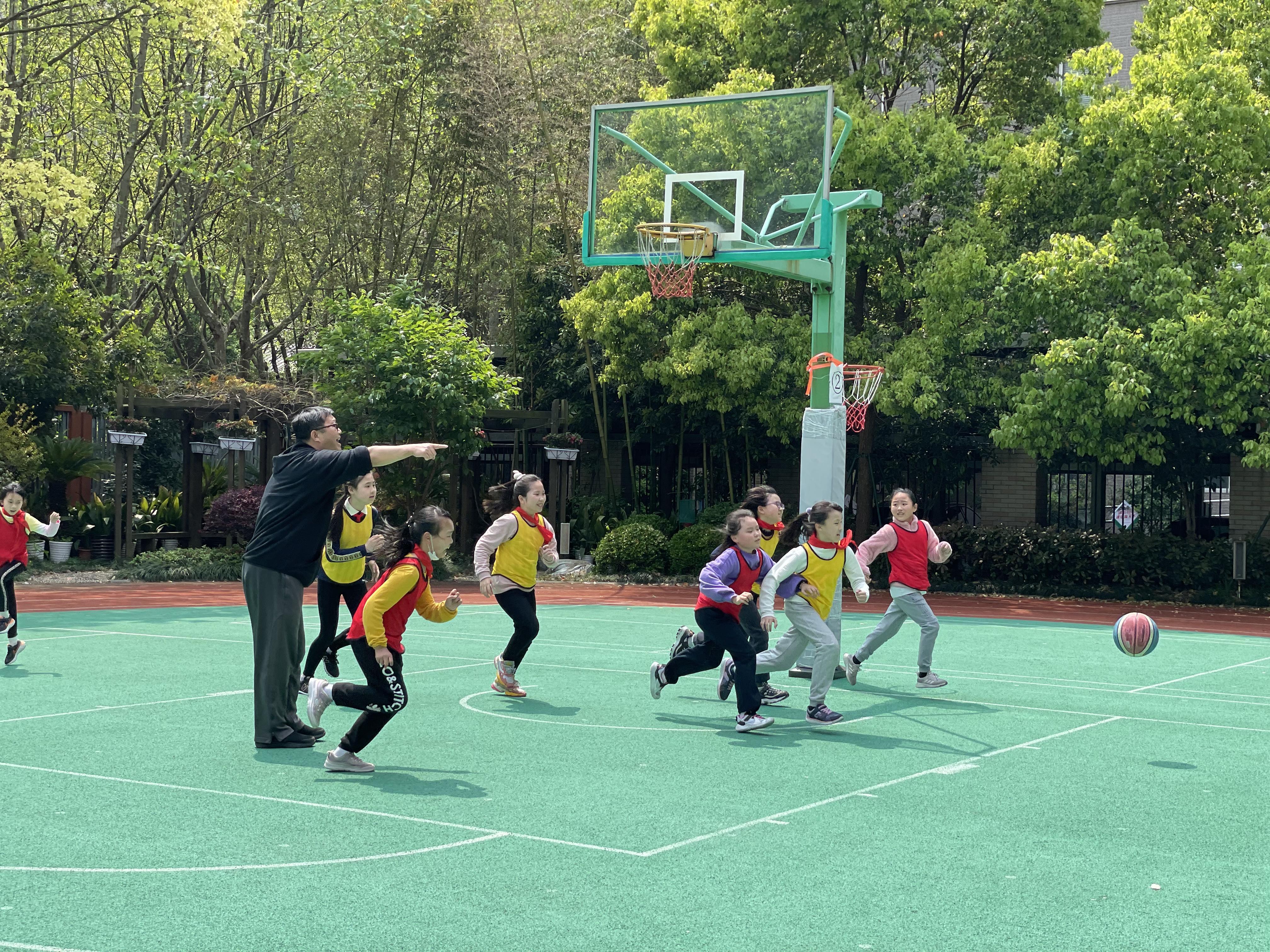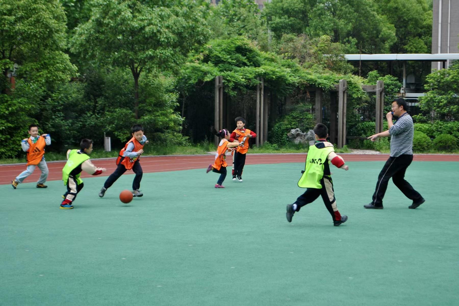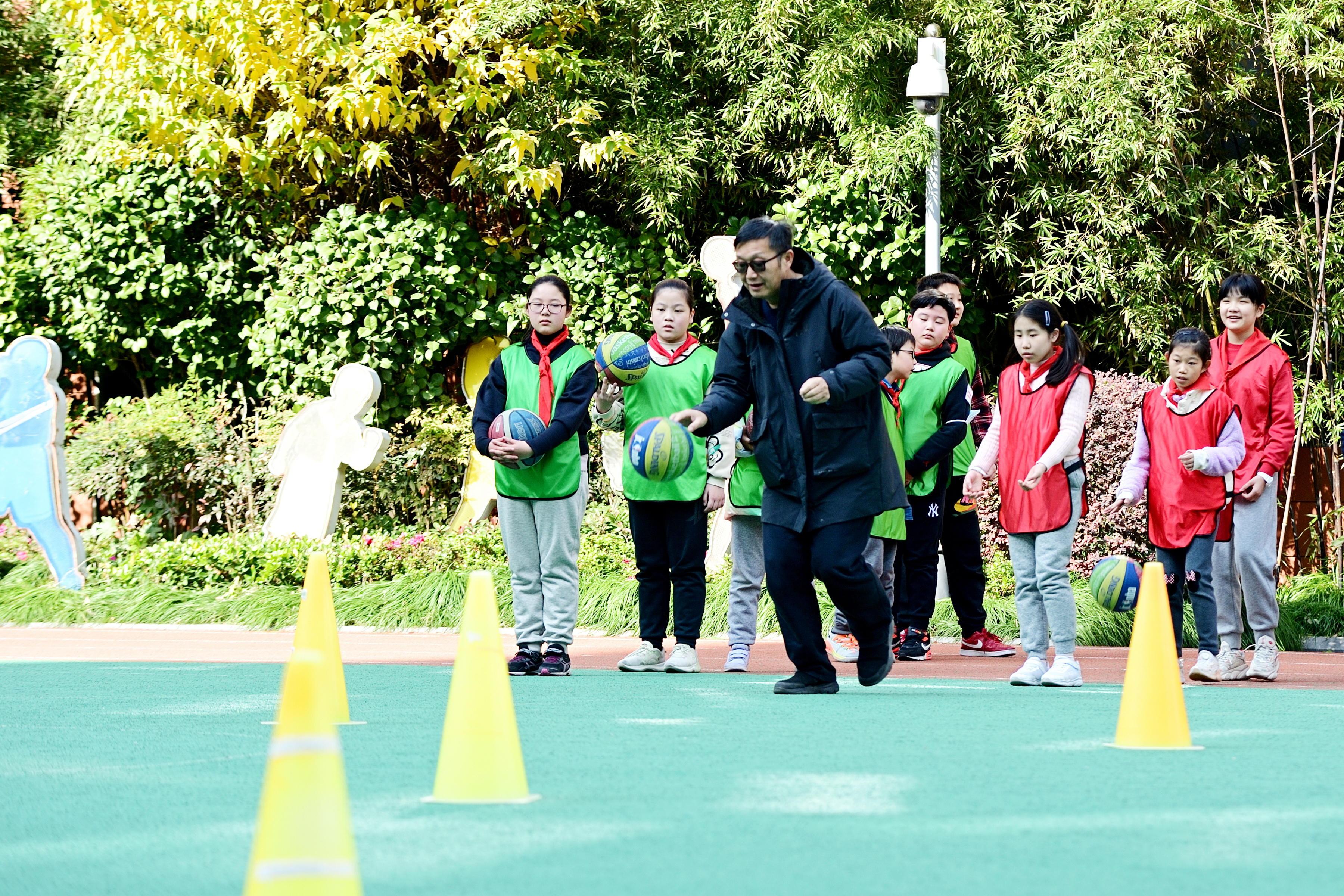 “玩运动”玩出了兴趣、玩出了花样,张老师不断拓展,又开始带领孩子们“玩篮球”——每天午间12:30-13:00,学校创设“睛睛篮球公园”,用学生喜闻乐见的“游园会”形式加入到篮球运动中。“神投手”“运球达人”……渐渐地,一股“篮球热”在黄一中心的校园里风靡起来。孩子们还自发去书本或网络上探究足、篮球文化,用他们认为最酷的方式出场、互相鼓劲,学习体育运动礼仪。