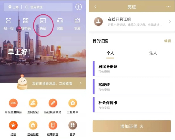 目前,“随申办市民云”推出的电子“亮证”功能汇聚了如身份证、结婚证、居住证、营业执照、出生医学证明等电子证照,正在我们的各类社会生活场景中得到拓展应用。