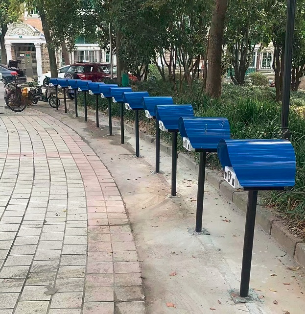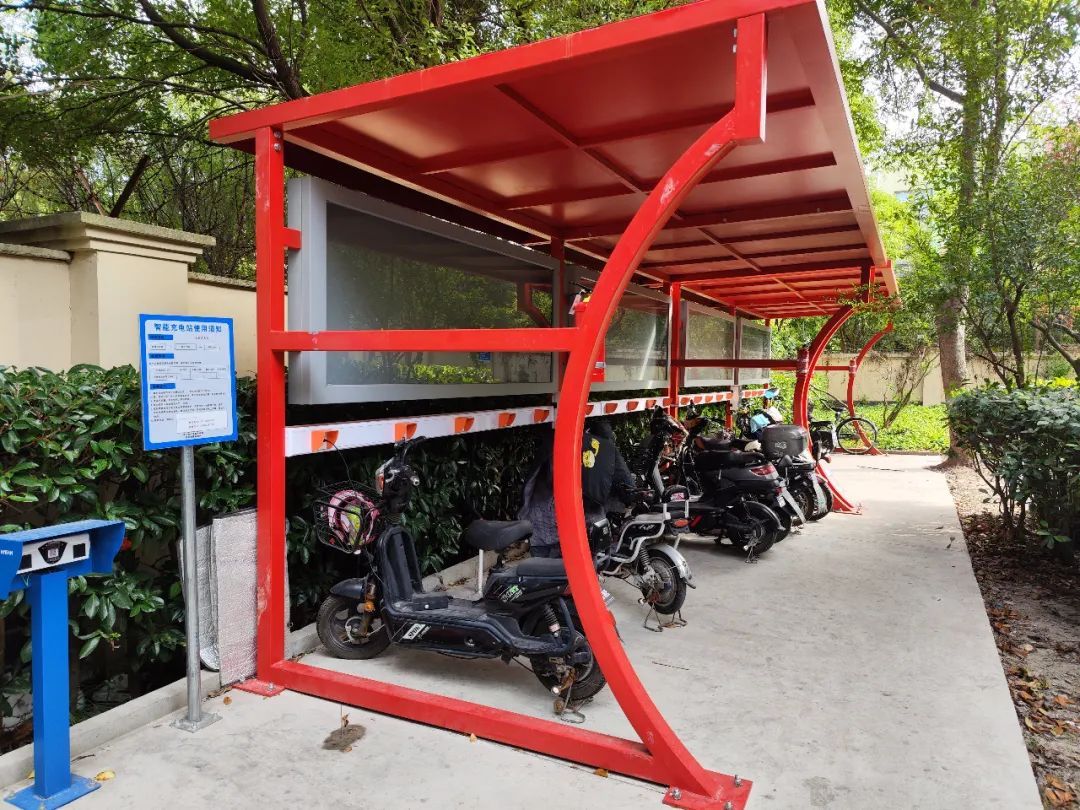 红的、白的、蓝的……小区的智能充电设备穿上个性化的外衣,模块化车棚成了一道独特的靓丽风景线。