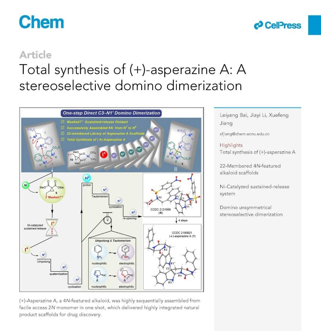 近两年,他以第一作者身份连续发表两篇全合成工作成果,其中Total Synthesis of (−)-Calycanthine viaIron-Catalyzed Stereoselective Oxidative Dimerization于2021年12月6日发表在《美国化学会志》(J. Am. Chem. Soc),Total Synthesis of (+)-Asperazine A: AStereoselective Domino Dimerization于2022年11月10日发表在《化学》(Chem),影响因子分别为16.4和25.8。